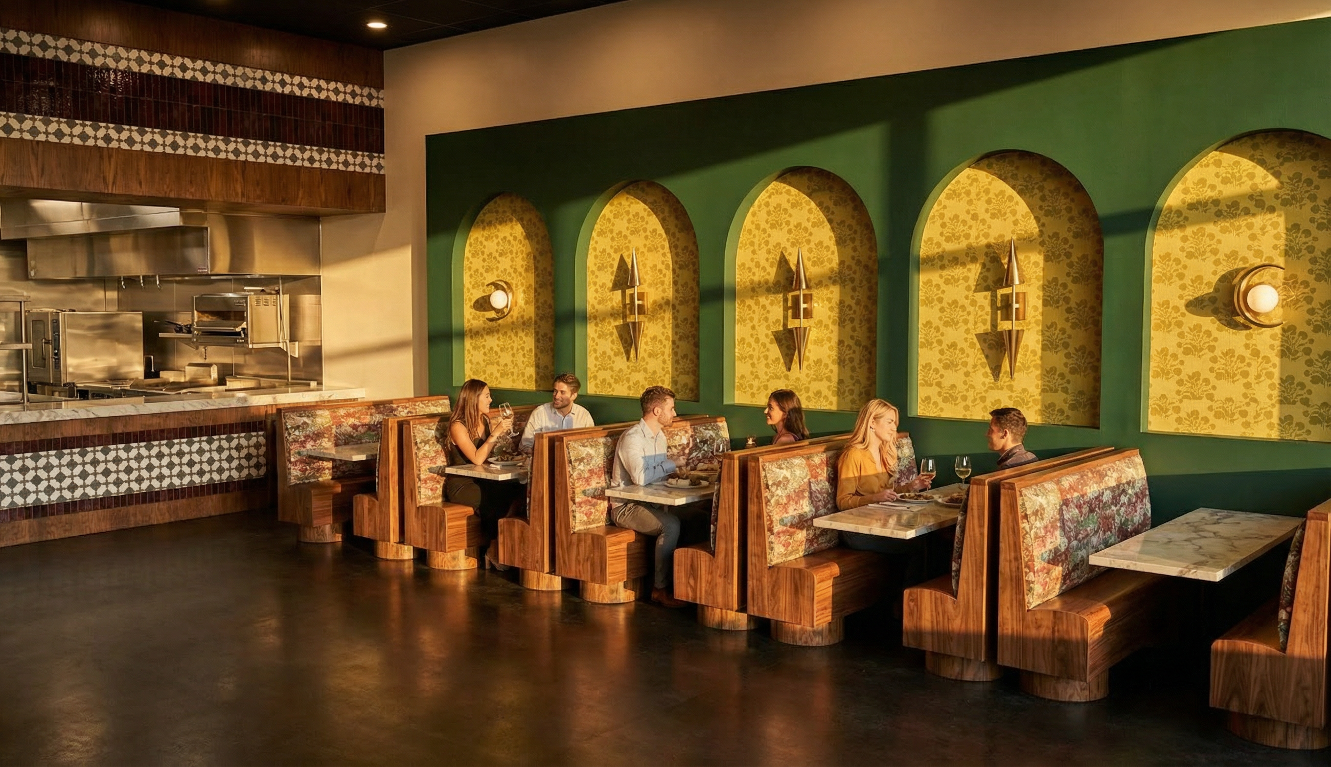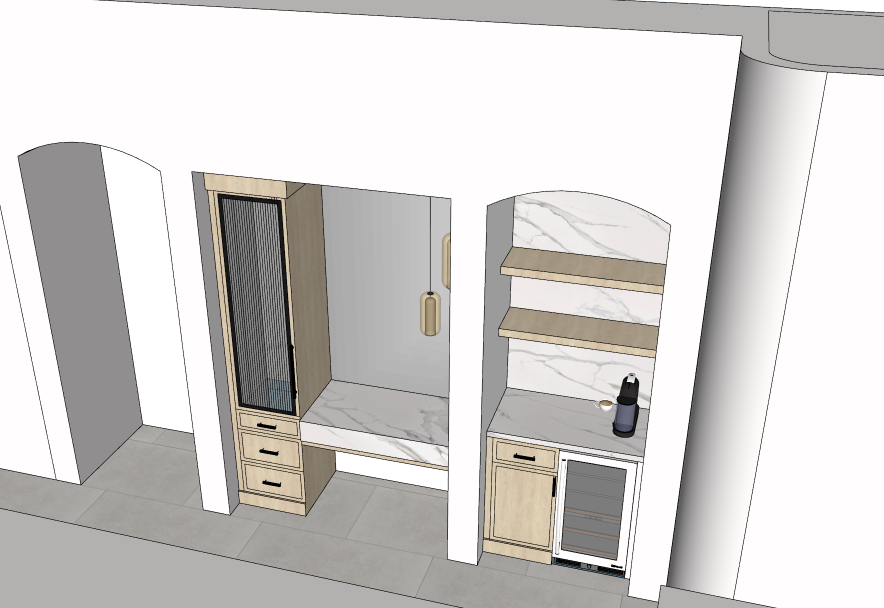 add a rug on the floor the floor tile is a light limestone lighten the walls to shoji white change the cabinets to rift white oak add reeded glass to the tall cabinet door less reflection in the shower glass black cabinet hardware add a few decorative accessories to make vanity and coffee wine bar but not too many full height mirror above make up vanity