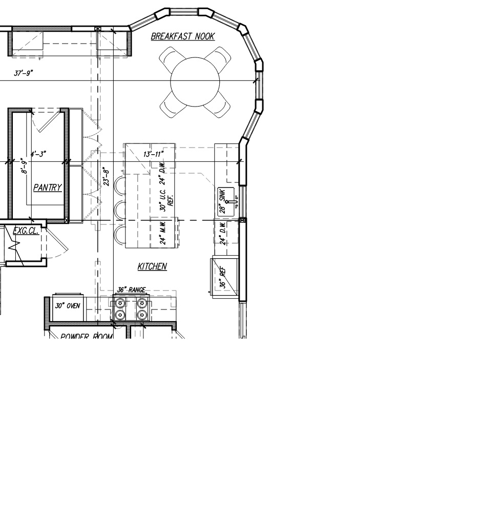 convert this floor plan into a realistic isometric 3d view of a kitchen show the space from an elevated angle with furniture walls and details visible flooring is 7 wide white oak plank countertop and backsplash is white carrera marble lower cabinets are light white oak upper cabinets are painted white refrigerator is 42 panel ready refrigerator with white panels oven is double stack in painted white cabinets hood above stove is white oak panels use the same furniture as shows on the plan do not change the orientation of the floorplan