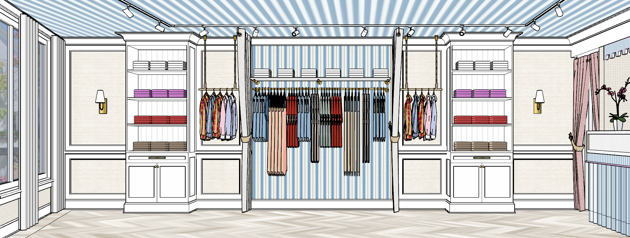 turn image to a realisitc photo of luxurious clothing store with casual people shopping illuminate evenly all interior spaces under light shelving all spaces should be highly illuminated