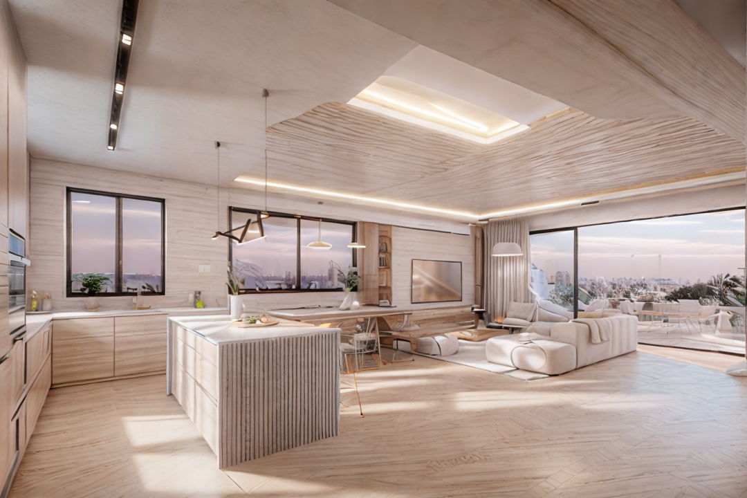 a masterpiec penthouse design modern and warm like a magazine cover picture colorfull architecture