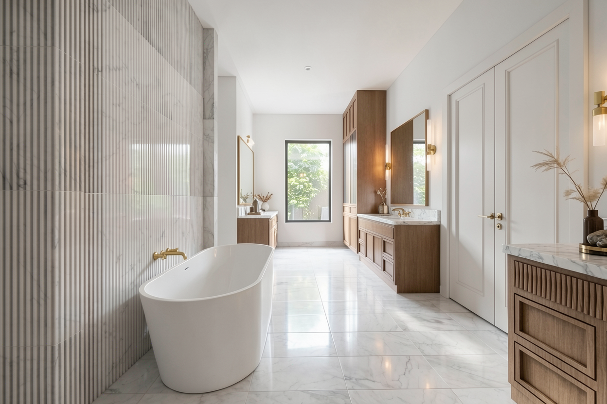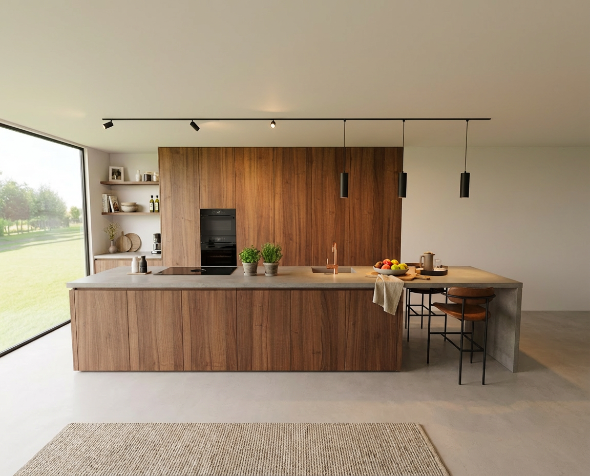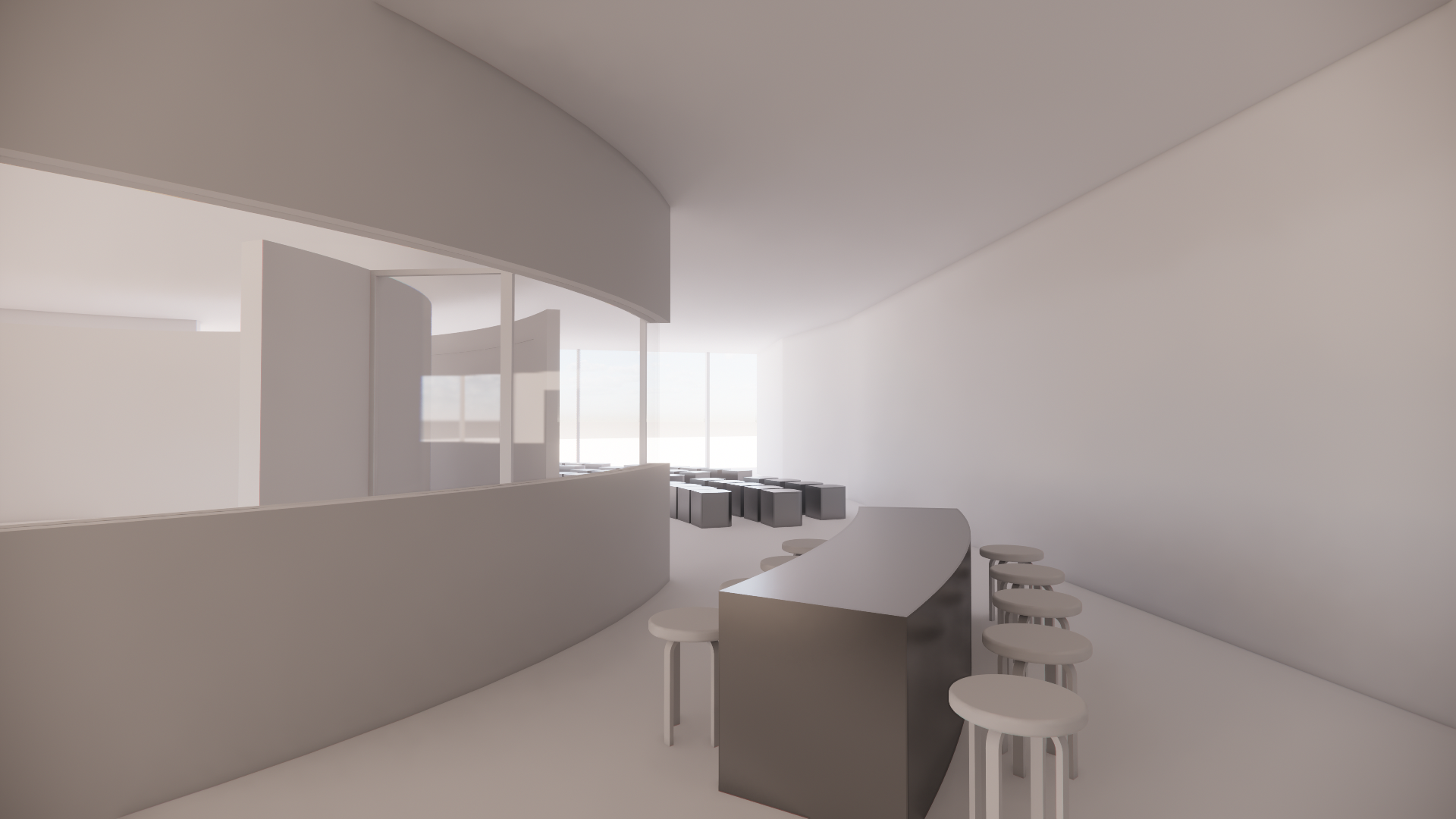 a curved walkway exhibition hall with seating there is a table in the centre with tablets on top for people to learn more and interact with the exhibition