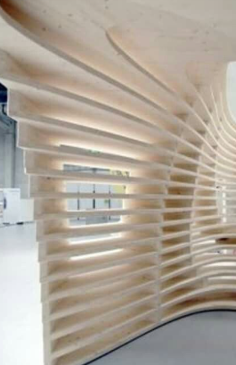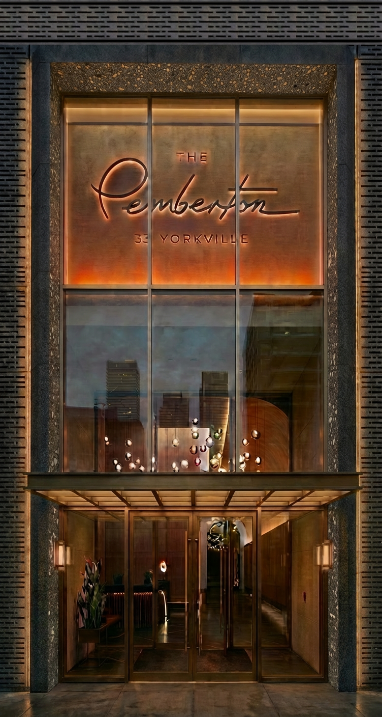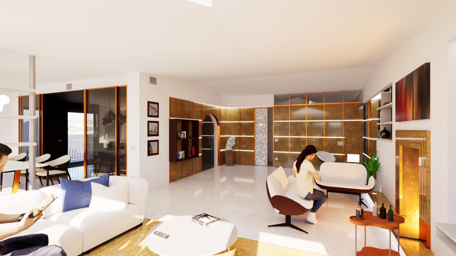 exterior shot hyper realistic architectural interior photograph of a grand luxury apartment living area the central feature is a monumental floor to ceiling feature wall composed of dynamic flowing parametric wood boiserie this computational design element is crafted from interlocking layers of polished warm walnut and lighter oak creating a continuous undulating wave like sculptural surface with integrated glowing linear led light strips that follow the curves the space is expansive with very high ceilings and large minimal frame glass partitions opening onto a city skyline view at dusk the overall architecture remains clean and contemporary the concrete floor is polished and seamless with a large plush wool rug furnishings are high end and super contemporary a massive curved modular sofa upholstered in deep charcoal velvet a geometric brass and marble coffee table and iconic designer armchairs in tan leather opposite the parametric wall is a large integrated fireplace and a collection of curated modern art sophisticated warm and inviting contemporary lighting scheme the integrated led lighting on the parametric wall modern pendant lamps and architectural spotlights emphasizing the textures of the wood and the luxurious materials