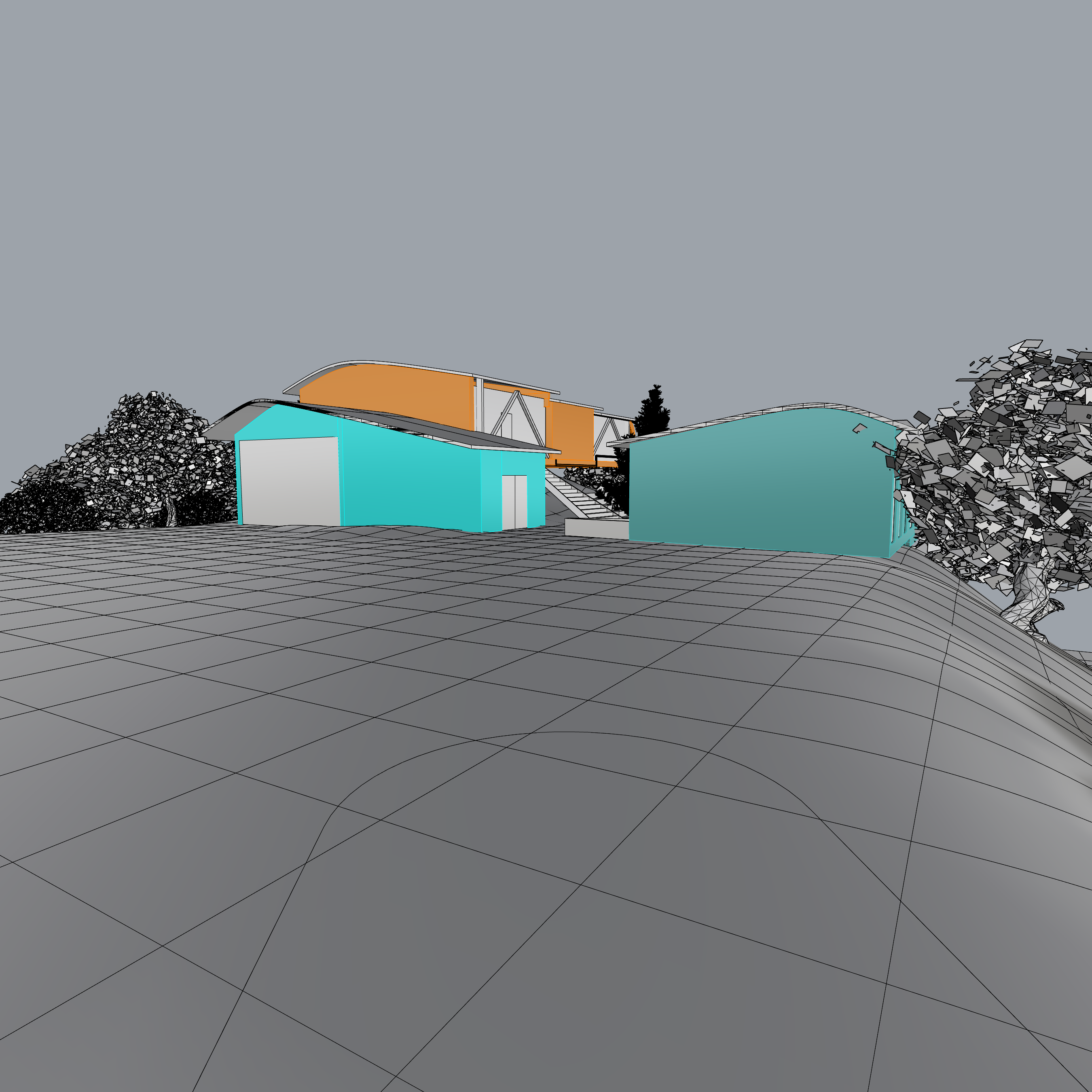render the buildings in this image with soft textures the roofs are textured corrugated metal the walls are light wood like a cabin render the image so it architectural dimension overlay make it look like a technical sketch
