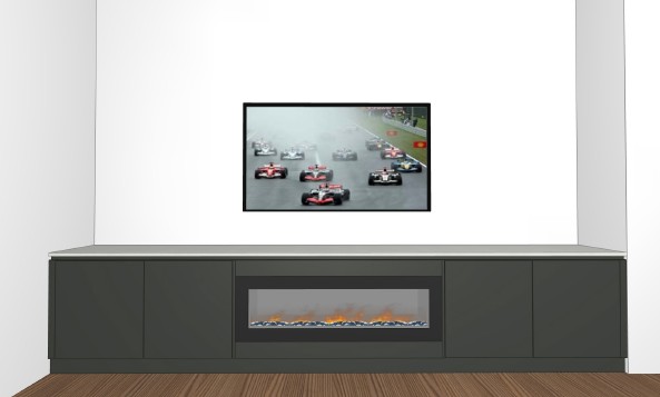 have someone sitting next to the fire and put a picture of sailing on the tv and a lamp and speaker either side of the tv make the cabinetry a dark charcoal colour benchtop to be white