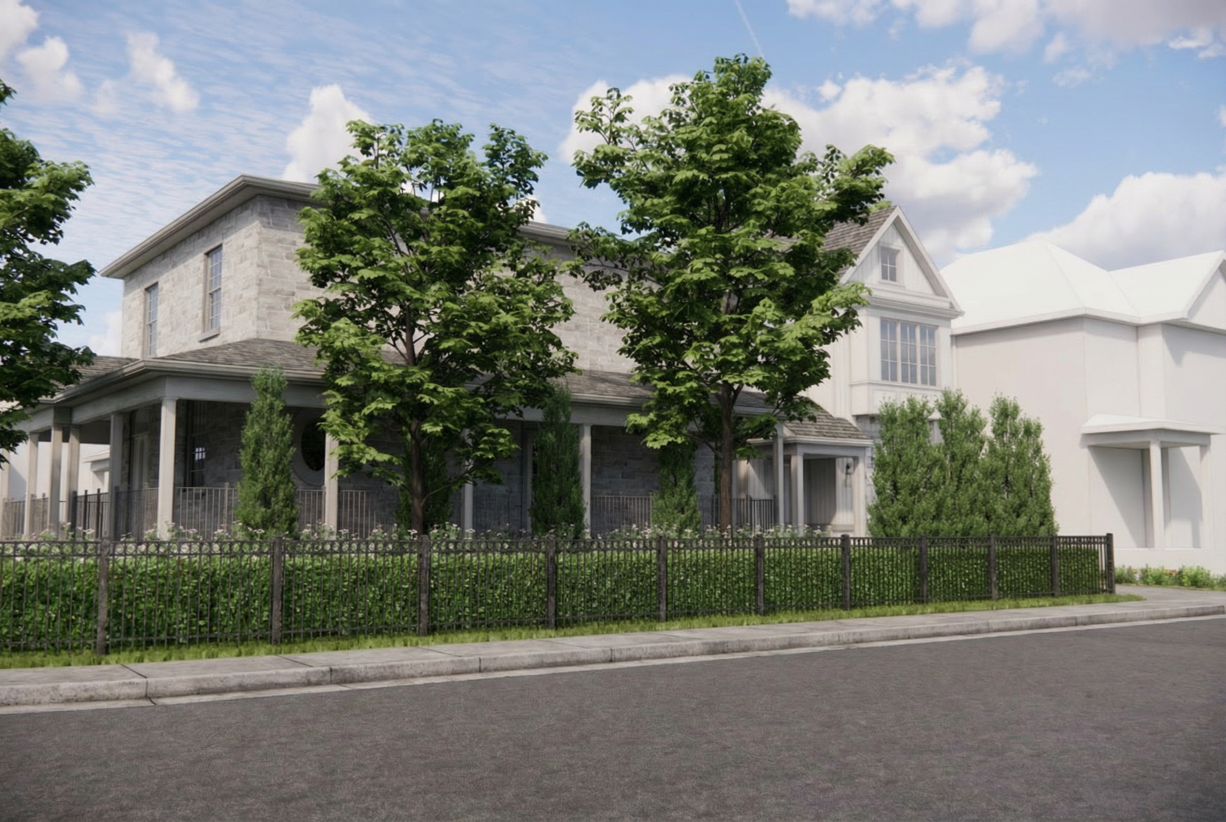 render a modern backyard patio with a minimalist design the central feature is a sleek charcoal gray pavilion with a grass covered roof the patio furniture consists of contemporary white sofas surrounding a stylish gray stone fire pit enhance the setting with lush realistic grass in a rich green shade contrasting with the cool light gray tiles of the patio the pool features a tranquil clear blue water with shimmering reflections surround the area with a warm wooden fence adding texture and natural elegance capture a serene inviting atmosphere under soft natural daylight bringing harmony to the modern outdoor space