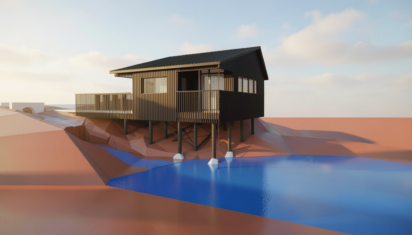 a modern lakeside cabin on stilts nestled against red sandstone terrain soft morning sunlight casting long shadows the cabin s wooden panels are a deep brown offering contrast against the vivid blue lake reflecting the soft pastel sky light clouds drift above creating a serene and tranquil atmosphere