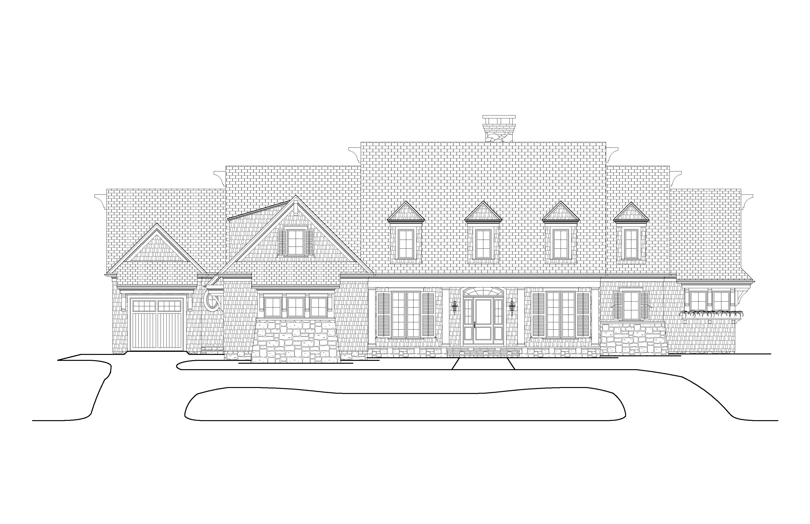 render a photo realistic shingle style low country home light gray shake siding dark grey roof white trim mahogany front door and garage door wet paver driveway and walkway lush landscaping vibrant blue sky with wispy clouds white rocking chairs on left side of front porch swing on right side of front porch
