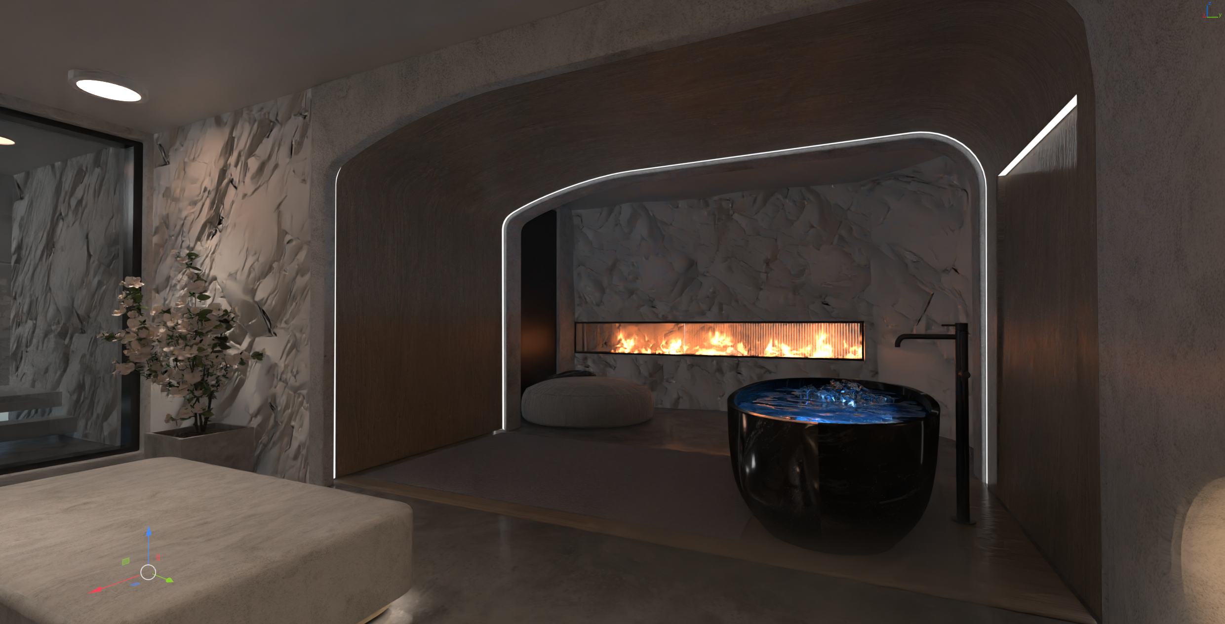 add stone texture on the walls add real water in the tub add shadows and dim lighting add a real fire in the fireplace