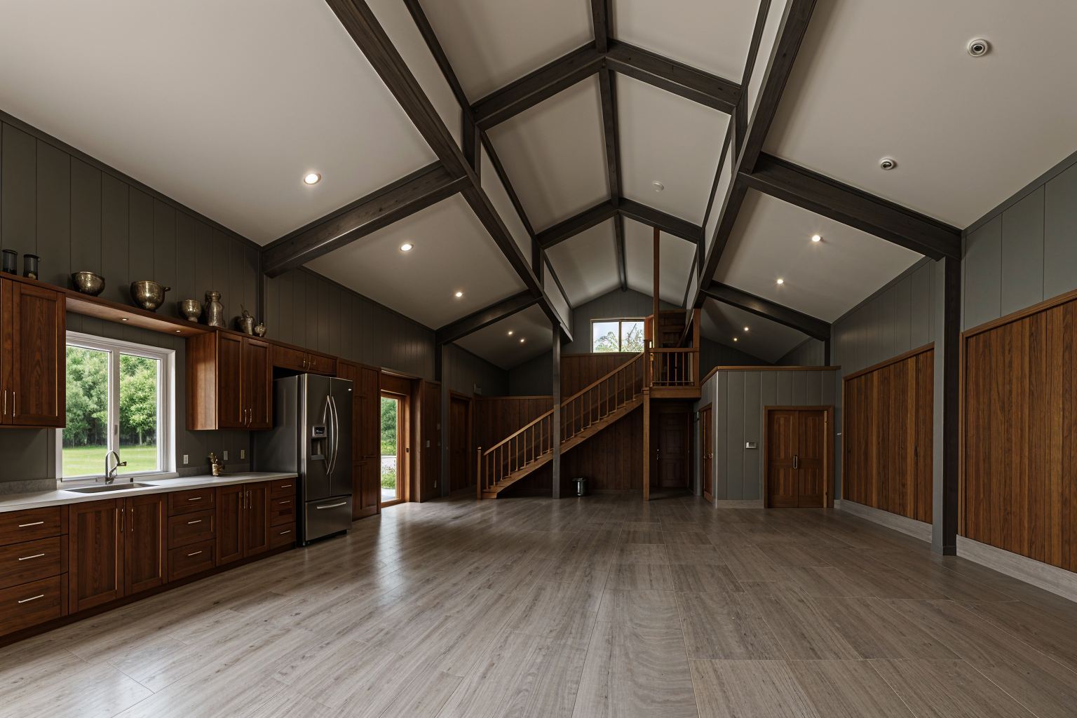 exposed steel structure concrete floor white ceiling make green walls shiplap dark base boards