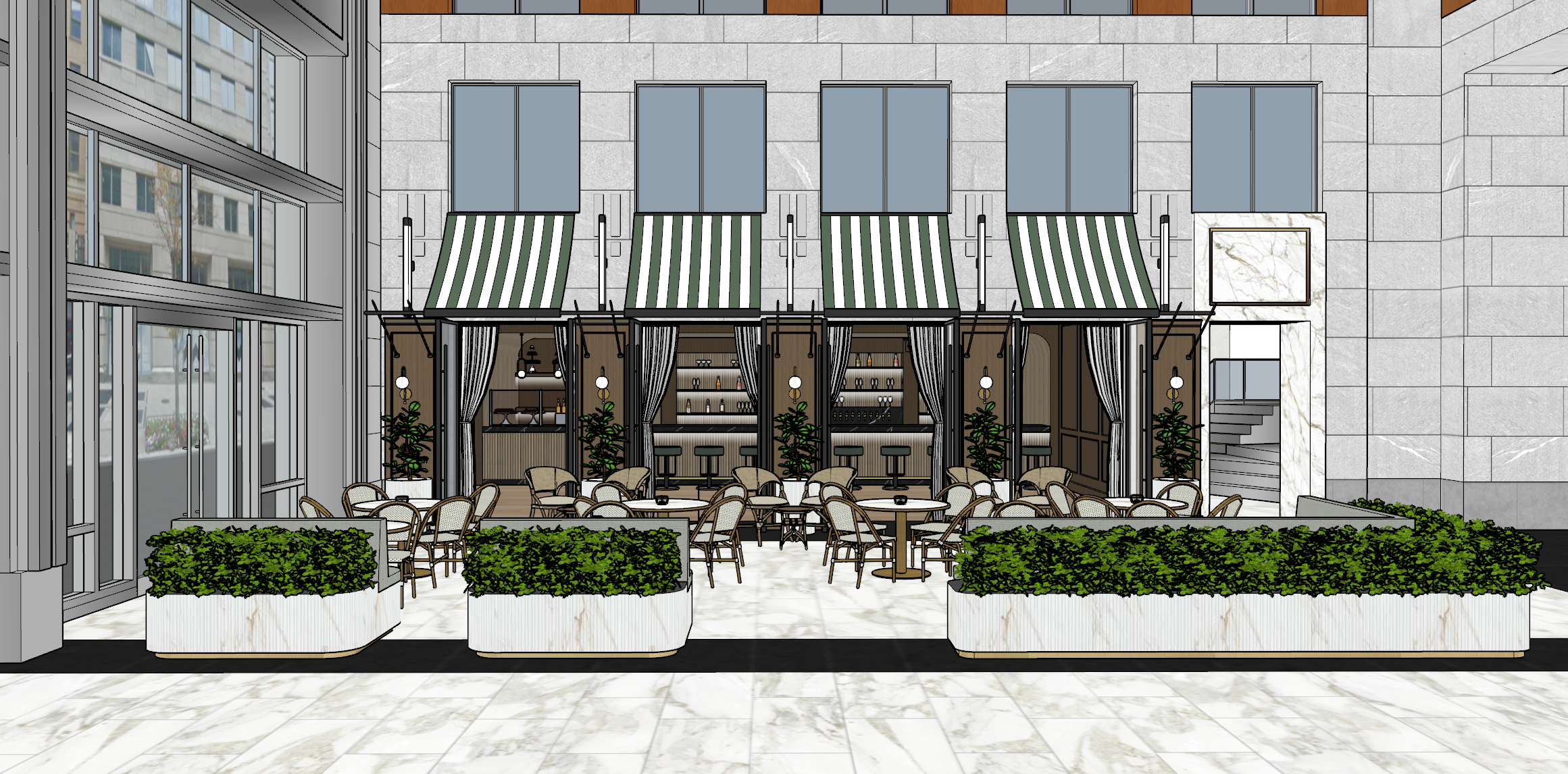 turn image to a realistic photo of luxurious lobby cafe seating add a lot of professional people day time seating illuminate all interior spaces illuminate staircase calcatta fluted planters walnut wood paneled columns in between doors and white drapery