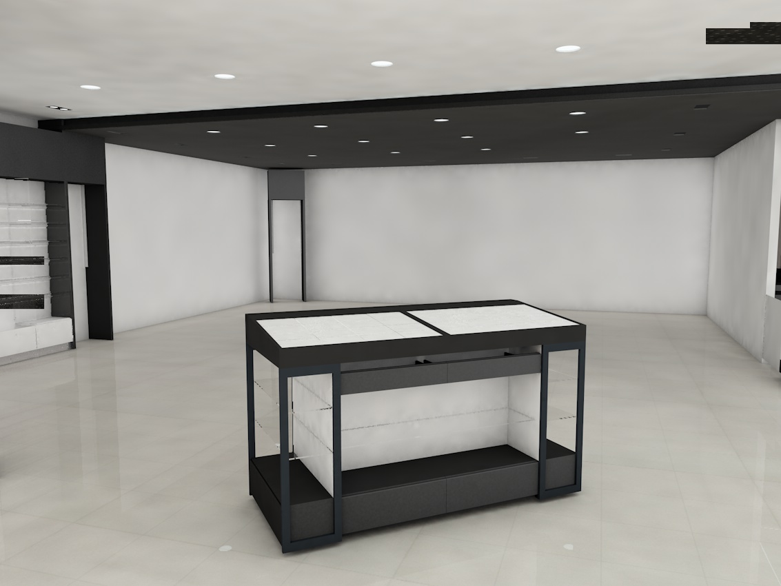 a modern spacious showroom interior with a sleek and minimalistic design the flooring is a glossy marble in light cream color reflecting elegance and sophistication the ceiling is a smooth matte black contrasting with white recessed lights providing a harmonious and ambient glow the display table in the center is a stylish black with a polished white top showcasing luxury and refinement walls are a pristine white adding to the spacious feel and maintaining a clean aesthetic the atmosphere is calm and professional exuding a sense of high end modernity and understated elegance