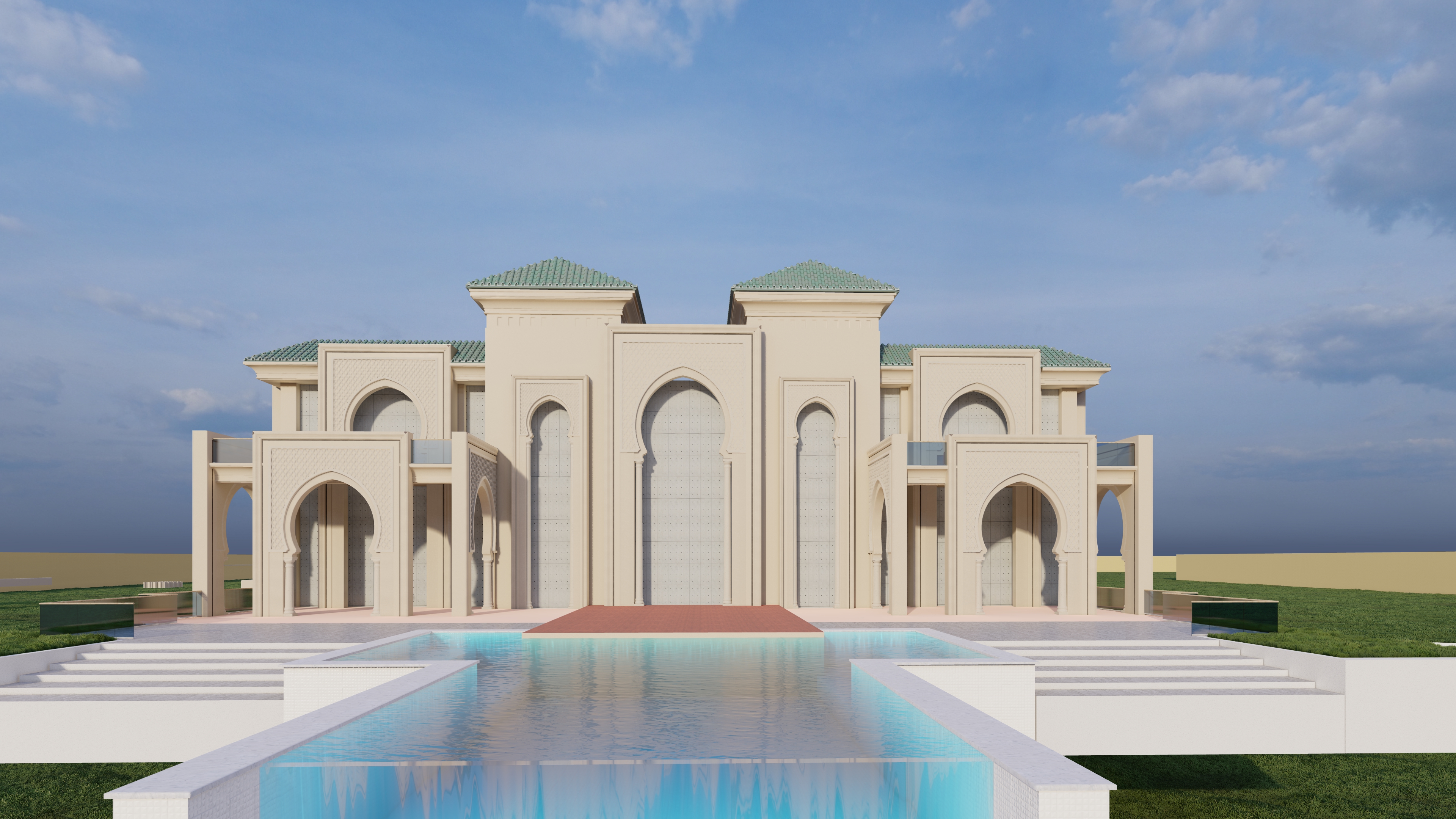 exterior shot moroccan style luxury villa traditional arches zellige tiles tadelakt walls carved plaster details central courtyard with fountain palm trees warm earthy colors natural materials golden sunlight cinematic lighting ultra realistic architectural render 8k