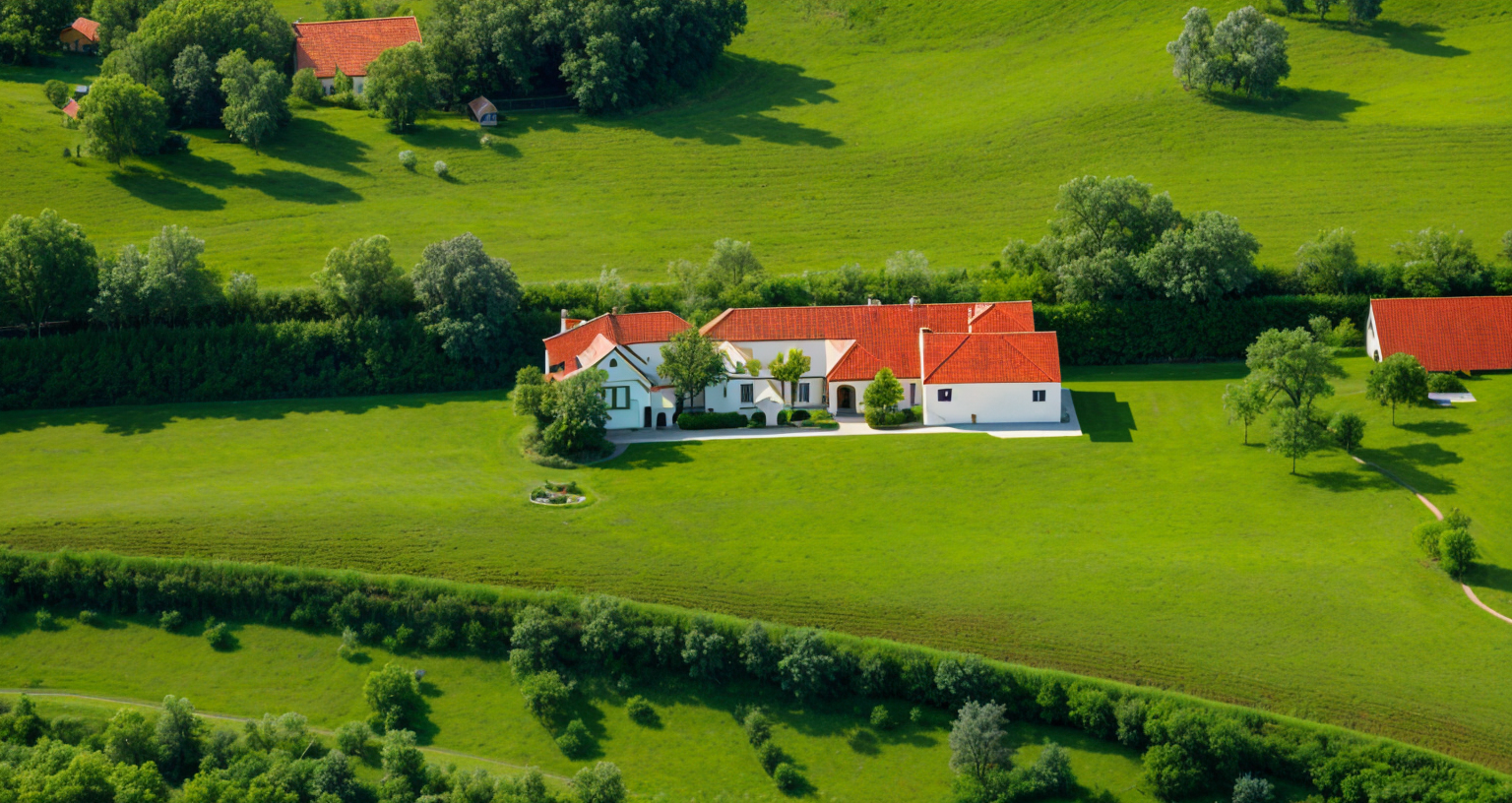 modernist exterior shot render a serene countryside landscape featuring a charming farmhouse with a terracotta roof set against a backdrop of lush green fields the house has rustic white walls and a pathway leading up to it surrounded by vibrant trees and neatly trimmed hedges in varying shades of green the sky is a clear bright blue and the atmosphere is calm and inviting reminiscent of a peaceful summer day architecture