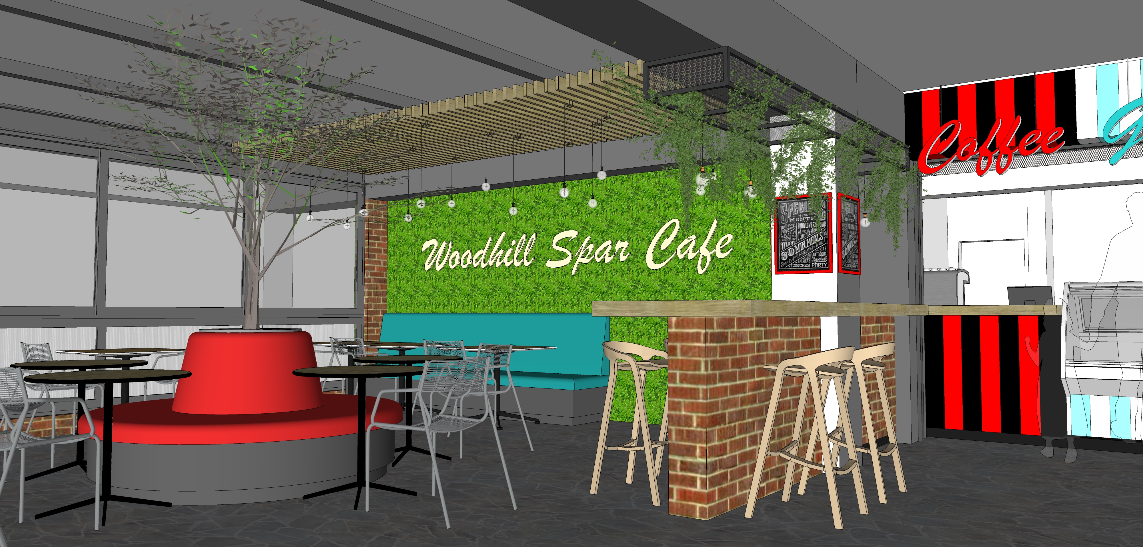 modernist interior shot create a beautifully rendered image of a modern caf interior the space features a lush vertical green wall with the words woodhill spar cafe in stylish white script font the floor is a sleek dark slate gray incorporate a central seating area with vibrant red cushioned seating and black round tables surrounded by metallic gray chairs a tree emerges from the seating area adding a touch of nature the ceiling exhibits a geometric wooden lattice with hanging round white lights on the right there is a bar with a textured red brick facade and natural wood top the counter area has a bold black and red striped pattern enhance the atmosphere with soft ambient lighting to create a cozy and inviting vibe architecture