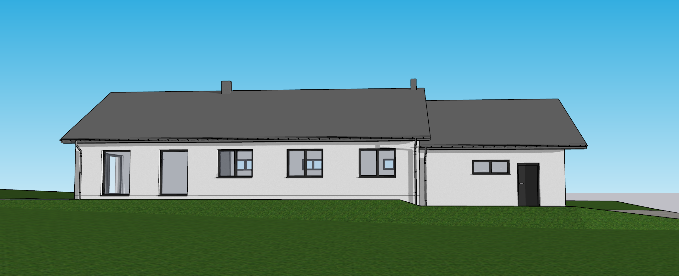 a flat grey roof tile laid in a staggered pattern white plaster on the walls a thin grey horizontal strip on the gable wall anthracite coloured window and door joinery a chimney covered with grey seam sheet metal low bushes around the house a sunny sky a light wood soffit lamps in the soffit curtains on the windows children playing a paved terrace a garden sofa and a barbecue on the terrace