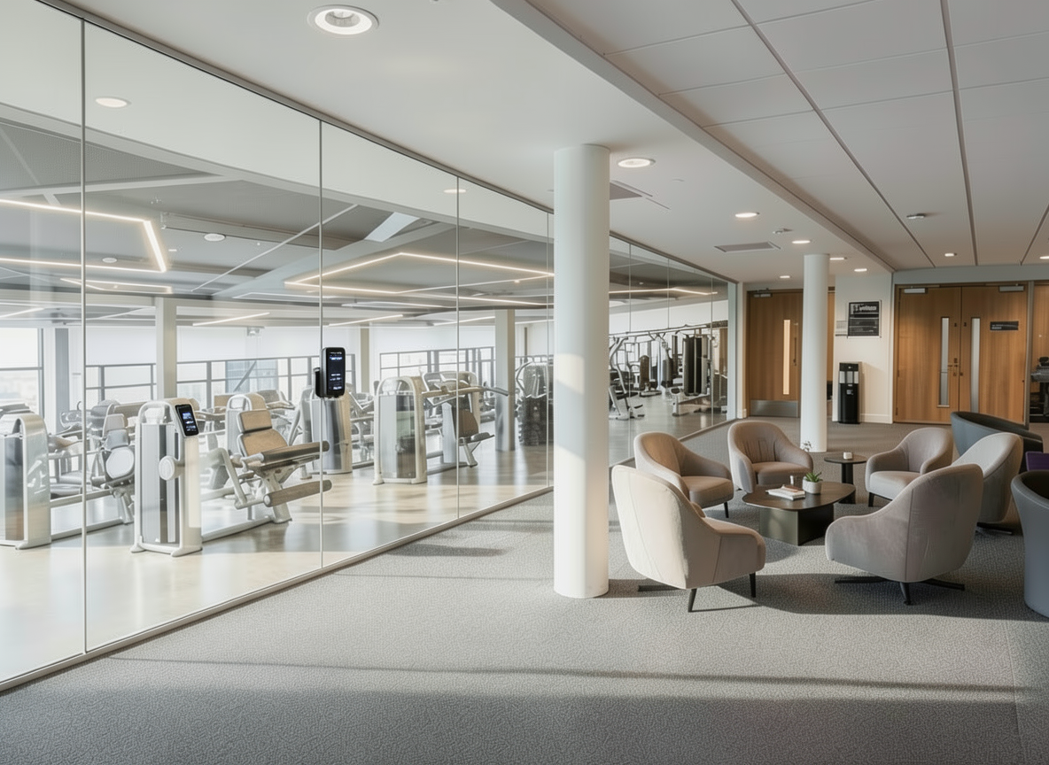 keep the existing composition and materials unchanged apply dynamic ambient lighting in purple blue green and orange only within the gym space visible through the glass curtain wall creating a modern moody gym aesthetic deepen shadows and enhance contrast to emphasize neon and ambient glow on gym equipment allow subtle colored light to filter through the glass into the lounge space on the right keeping the lounge lighter and maintaining its natural tones without altering materials or mood maintain ultra realistic rendering high detail architectural visualization modern luxury interior and cinematic mood lighting do not change any furniture carpet or structural elements in the lounge or elsewhere do not add people