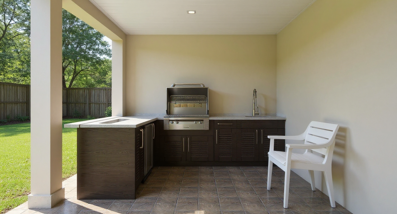 shipping container entertainment area coastal vibe with strings of lanterns and potted plants