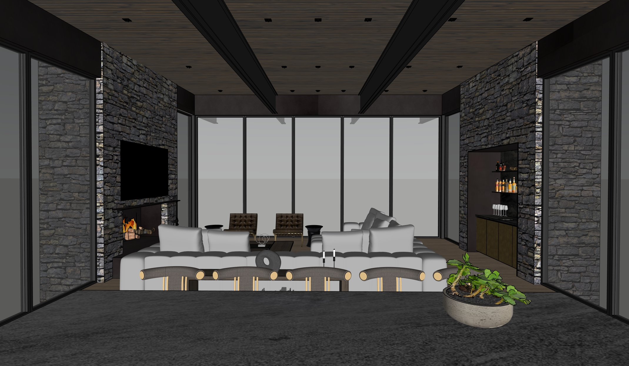 do not remove or change any geometry in image rough hewn tennessee fieldstone dark metal window frames cold rolled steel beams dark metal panel walls brass lower cabinets and glass shelves at bar light coming from can lights add integrated led lighting in bar area home located in north carolina hardwood forest with dense trees below home late afternoon light with partly cloudy skies view of blue ridge mountains in distance room is 20 above the ground so no plants or hardscape directly outside of windows