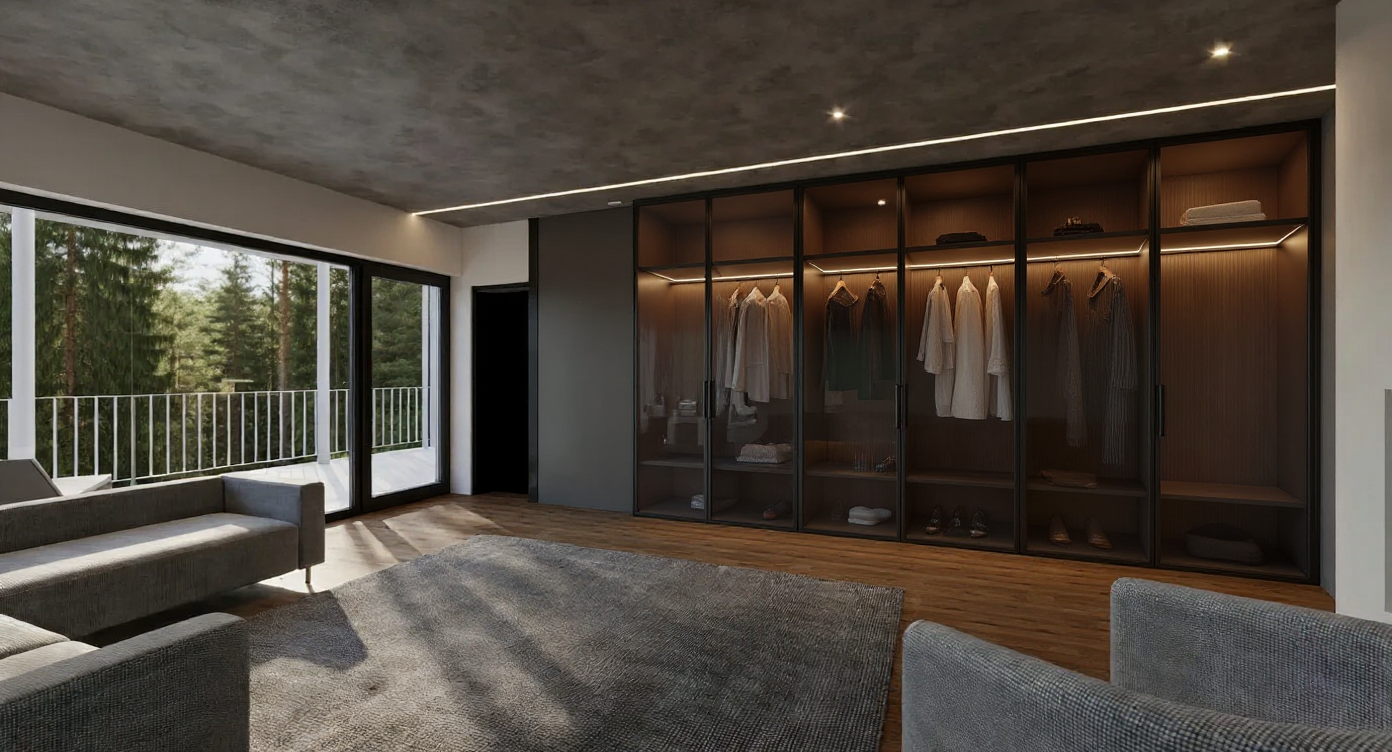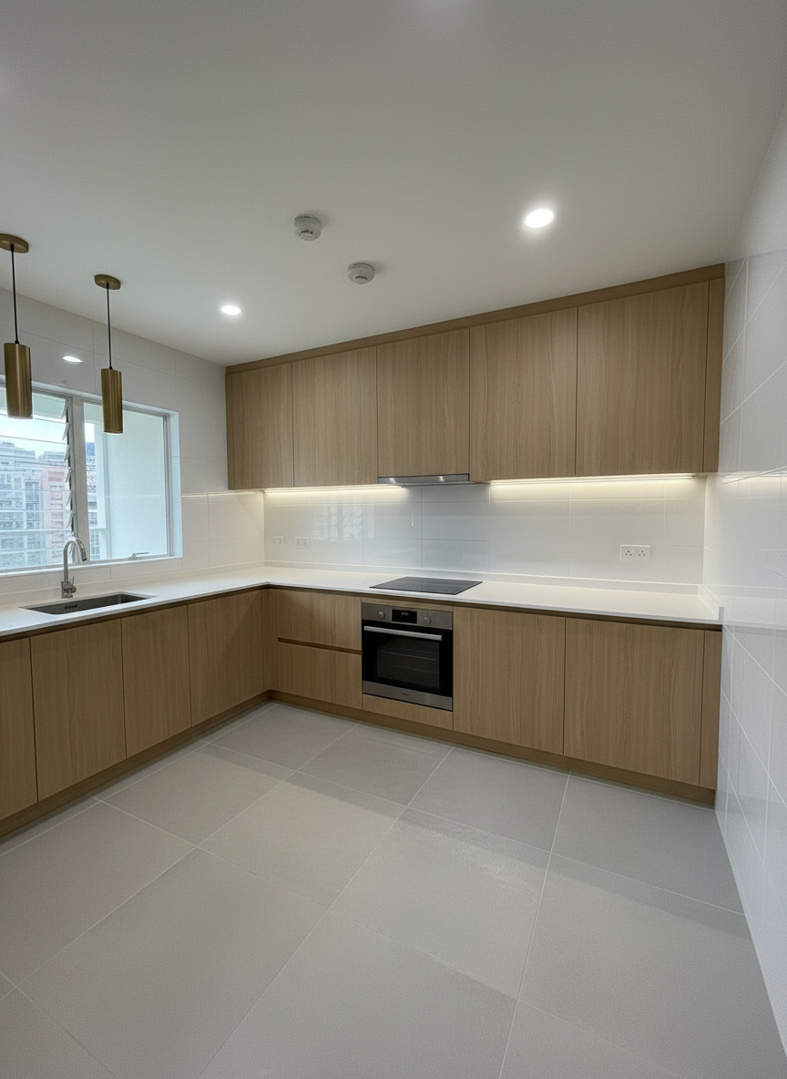 keep the building identical to the reference image same architecture balconies windows proportions change camera angle to a side perspective showing depth of the building and courtyard morning sunlight with soft shadows and bright blue sky add lifestyle scene parents with stroller children on playground couple talking near entrance plants and ornamental grasses moving in wind scandinavian style landscaping calm residential atmosphere photorealistic architectural visualization ultra detailed professional real estate marketing render