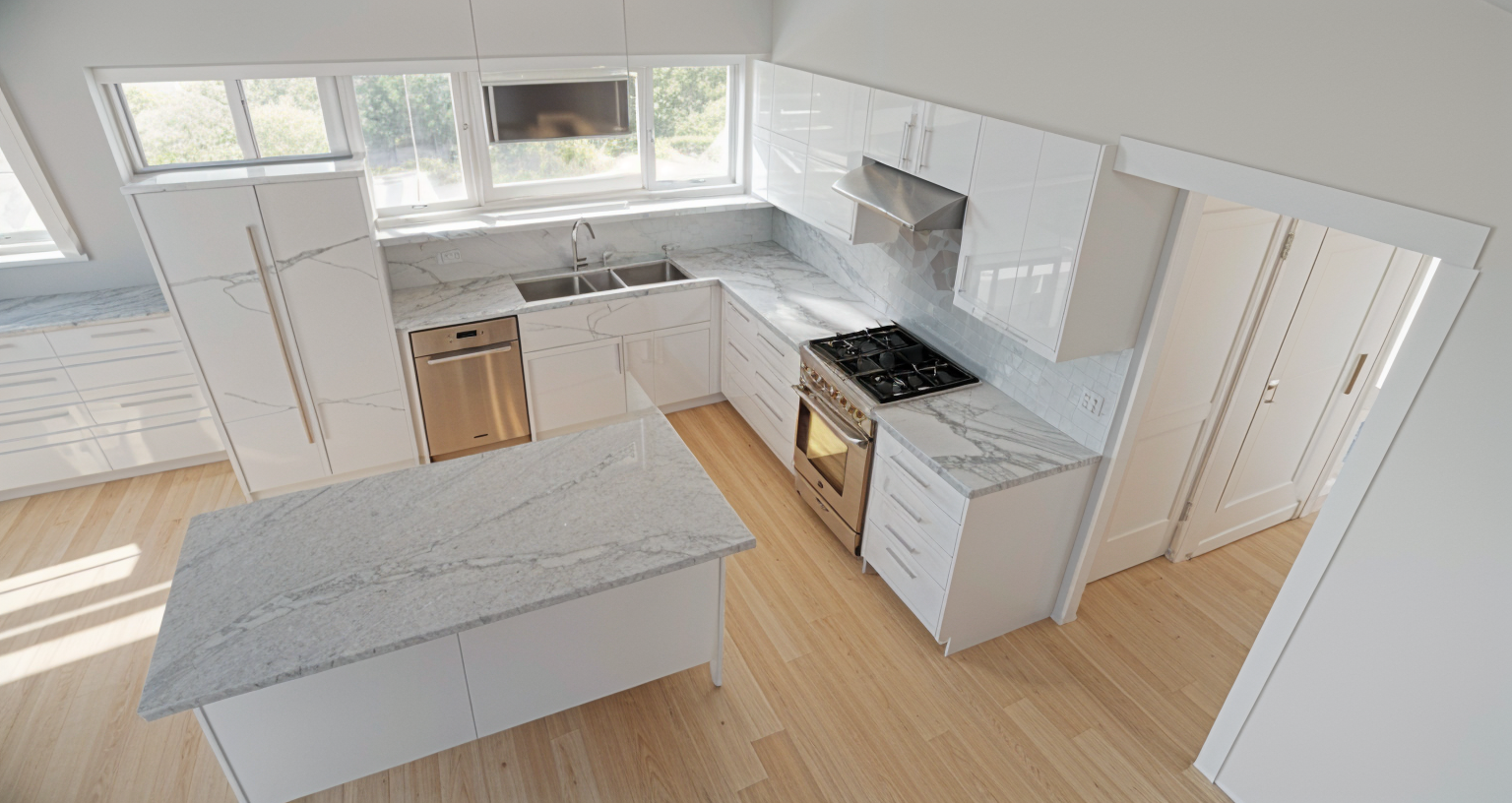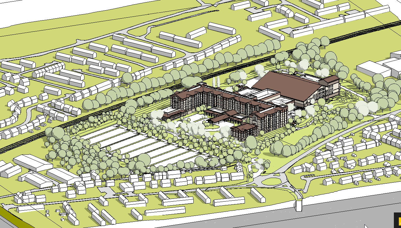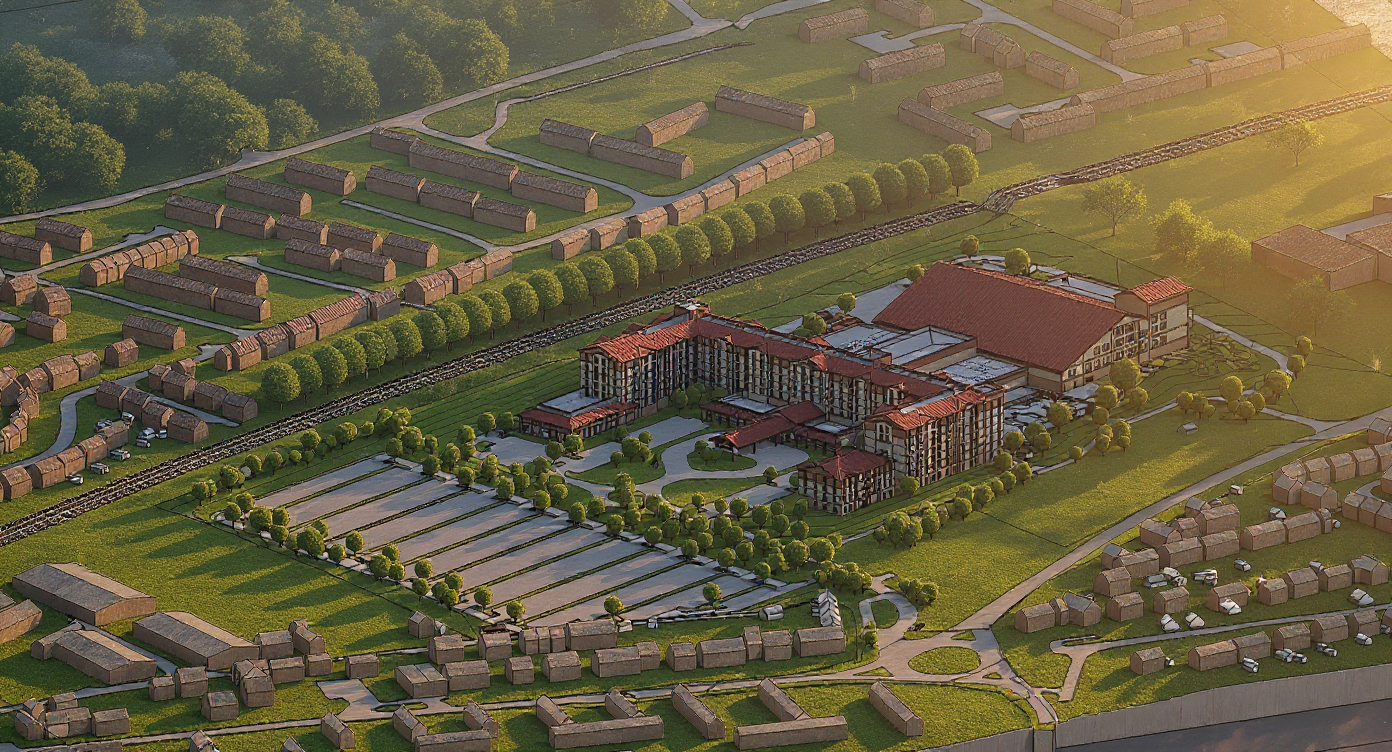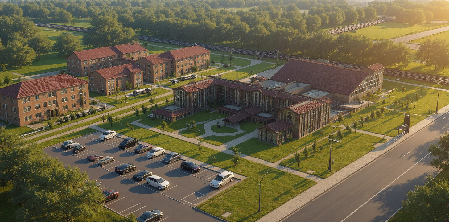 add reflection to glass main building is surrounded by greenery surrounding buildings are to be brick with red tile roofs park many cars randomly on the car park add more greenery this is summer morning scene with sunlight coming from the bottom right side of the scene add railway line along the row of trees in the upper part of the image closer to the building make sure cars and railway match the scale of the building