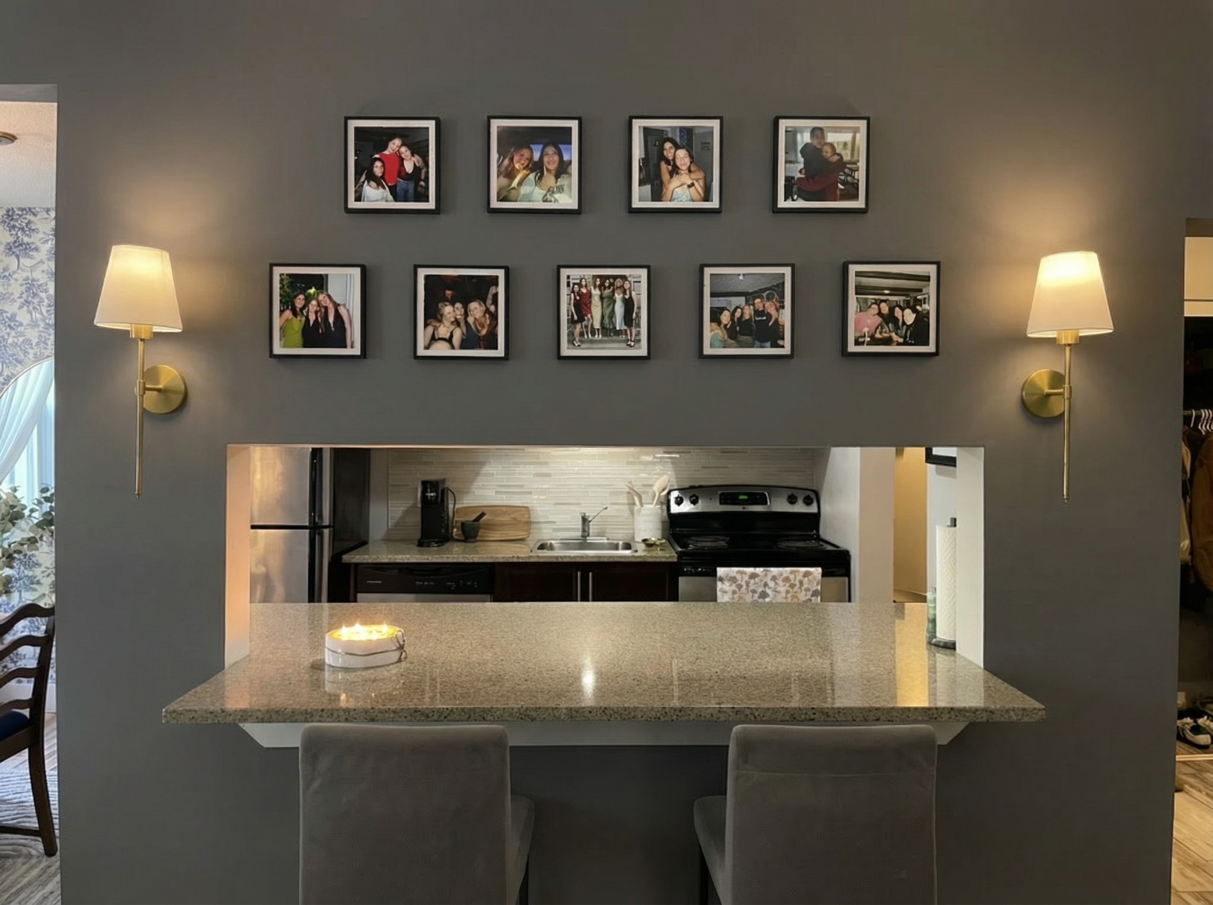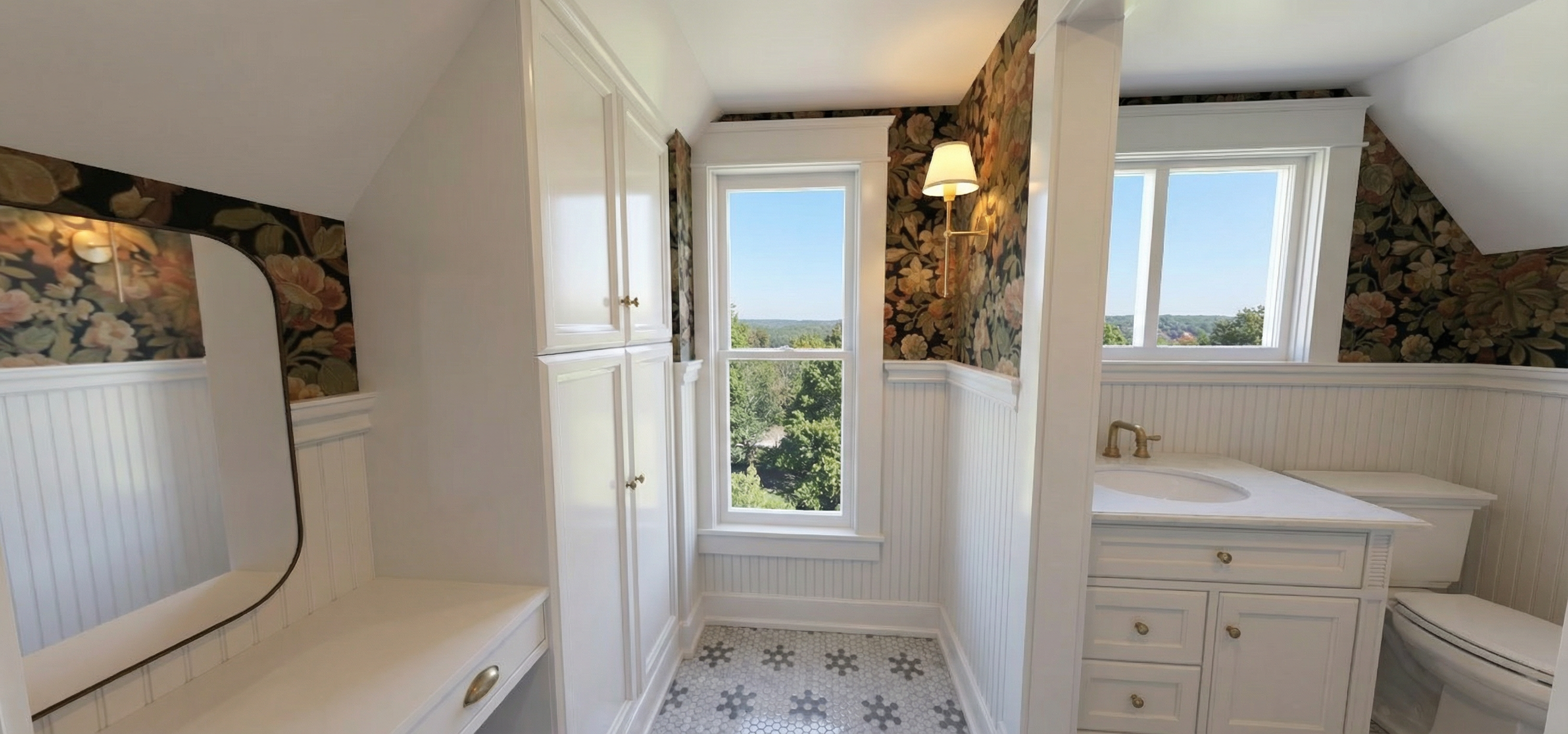 maintain all geometry create a hyper realistic interior rendering this is a second floor room so the view out of the window should reflect that and show trees in the distance the painted casework should be a semi gloss finish the wood casework should remain as wood with a gloss finish the sconces should be lit in a 2700k temperature and a soft glow show the casework painted white and the ceiling as well