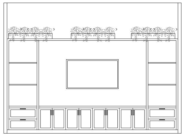 navy blue bookcase with a tv displaying a landscape black planters with pothos and brass handles wall to be a light gray wallcovering with a subtle shimmer