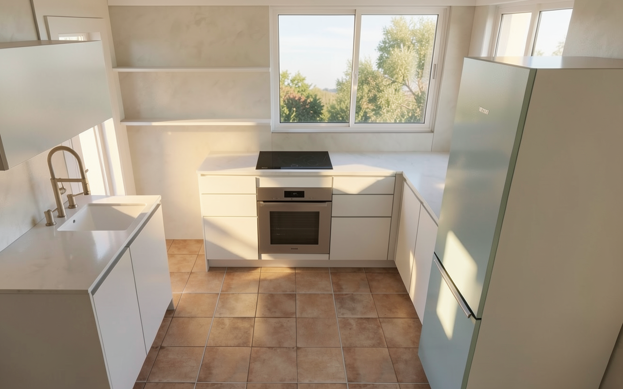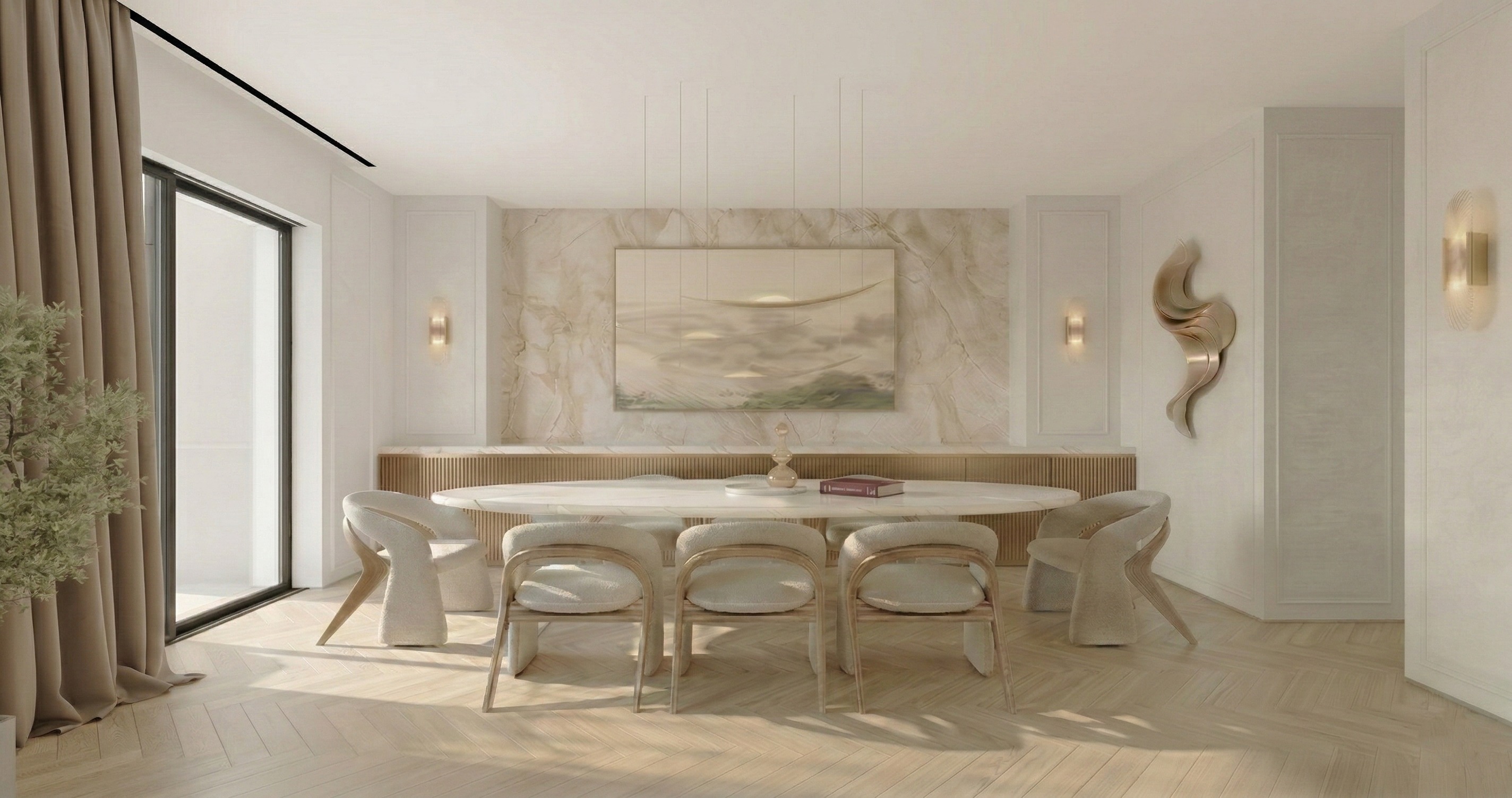 take this semi final render and enhance realism without altering any of the current image s geometry features or objects as well as image orientation no cropping zooming etc final result must be 4k do not add any new objects keep the herringbone pattern exactly as is but increase the tonal variation between individual planks each stave should have a distinct natural shade ranging from light sand to muted beige change the surface to an ultramatte raw timber texture with visible open grain removing all artificial sheen or plastic like smoothness the goal is to see a clear organic contrast in color from one tile to the next emphasizing its wooden nature yet making the effect visible yet delicate and so it doesnt stand out too much the goal is for the change from the original to be subtle as for the materials though its important to make them clear and visible we are aiming to respect the softness and elegance of the composition as a whole for that reason no exaggerated contrasts or saturations are welcomed here the result must be elegant and high end displaying the materiality while keeping the composition s luxurious and sophisticated approach result must be high res 4k for client viewing