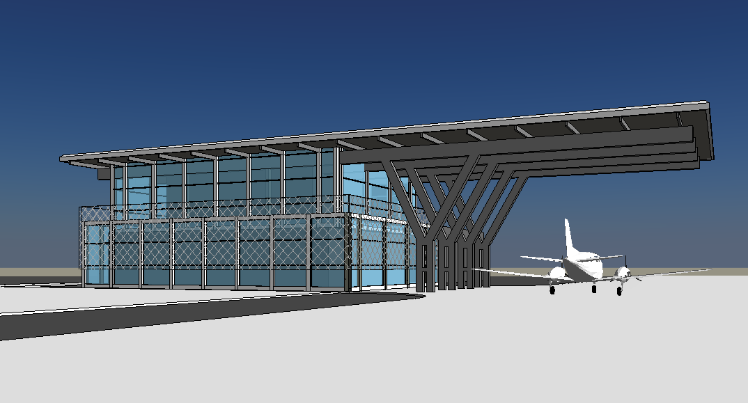 herzog de meuron exterior shot want to add metal perforated corten screen around curtain wall which allows light from the interior to glow from the inside to the outside architecture make metal panel 30 percent perforated with pattern make background typical south texas airfield background with no trees foreground all pavement add rooms to second floor