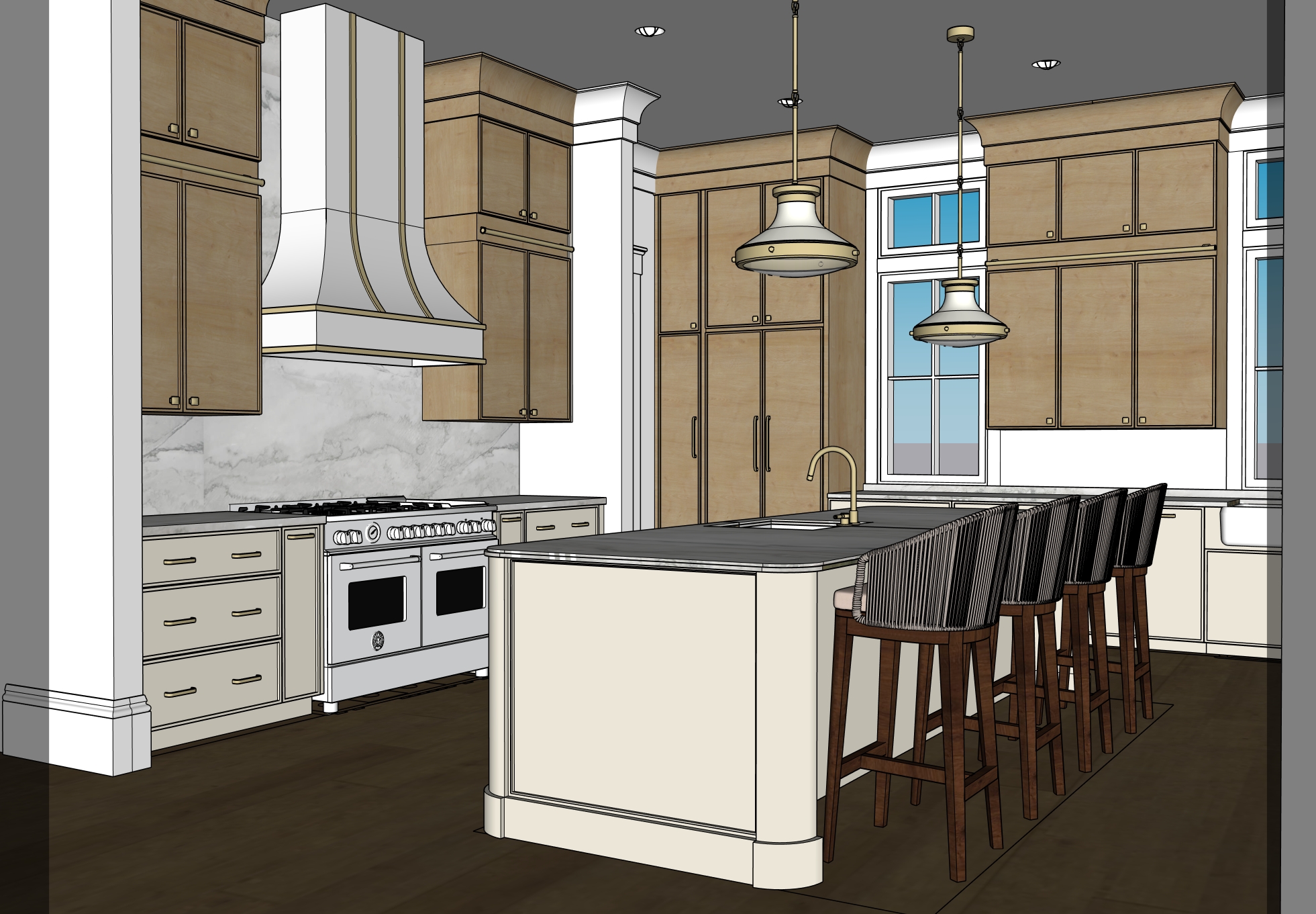 make the 3d render look photorealistic the floors should be a medium white oak the upper cabinets should be white oak finish and the base cabinets and island should be a creamy white finish the pendants above the island should be cream and gold create a scene out of the window that is similar to one that would be outside of a suburban home