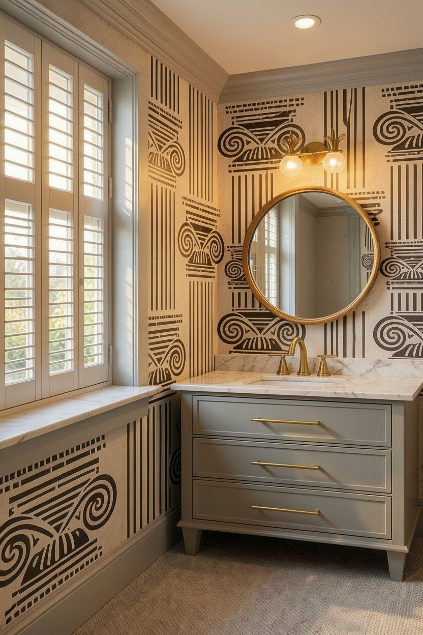 the window ledge below the shutters is marble make it painted to be the same color as the vanity and trim