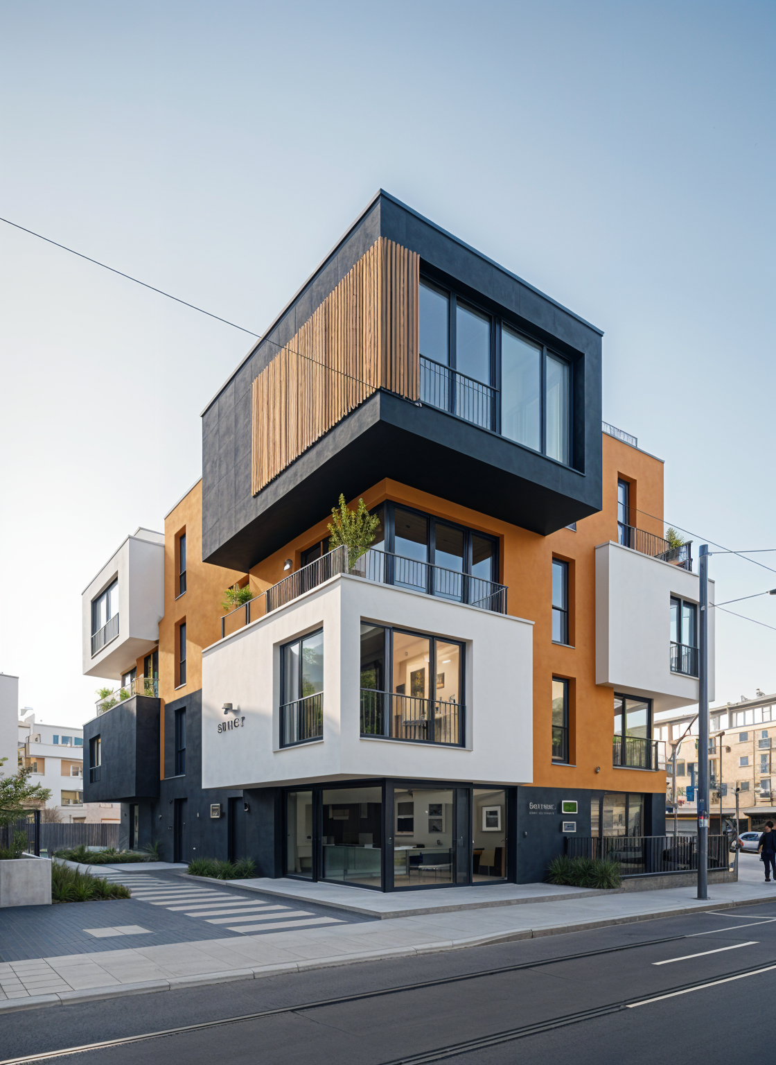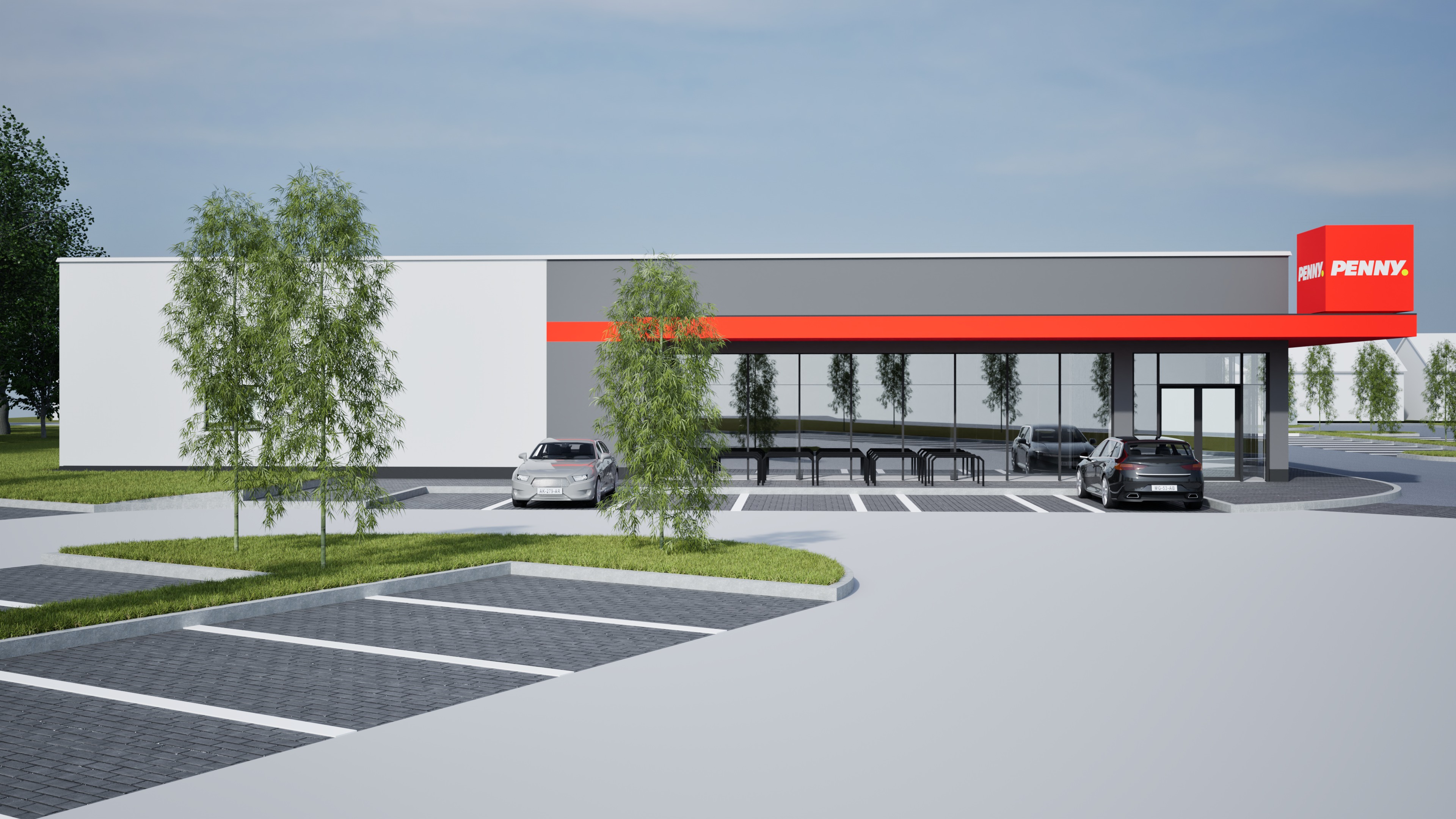 create a beautiful architectural rendering of a modern store with clean lines the building is sleek with a dark gray facade and a striking red horizontal accent at the entrance the surrounding trees are lush green providing a natural contrast the sky is a soft blue with a hint of morning light and the pavement is a light gray tone the atmosphere is calm and serene evoking a sense of early morning tranquility cars are parked in the lot painted in black white and red adding subtle variety to the scene make more realistic render with golden hous lights don t change anthing on model