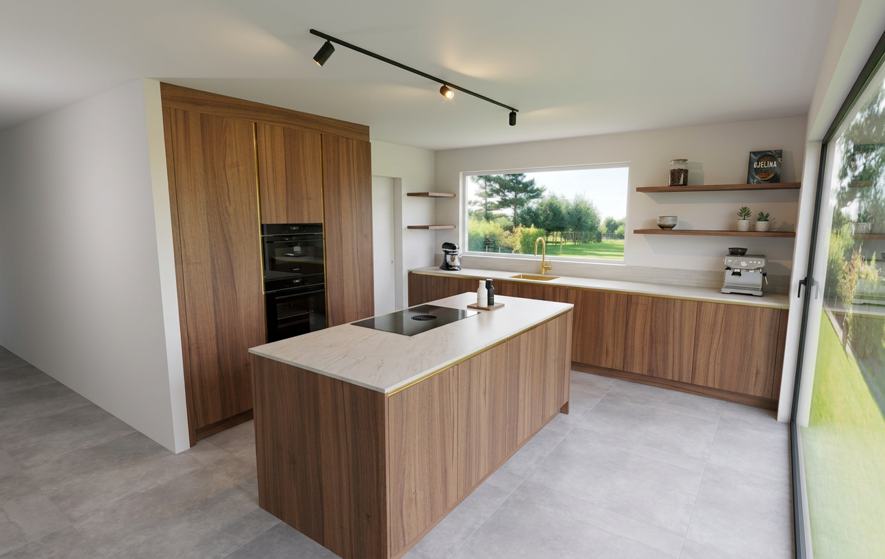 genau dieses rendering berarbeiten fotorealistisches innenraum foto exakt dieselbe perspektive und kameraposition wie das hochgeladene referenzbild 100 identische raumgeometrie exakt gleiche m belanordnung exakt gleiche verlegeart und richtung von parket und platten wie vorlage parket ruhig und hellgrau weiches nat rliches tageslicht raum k nstlich ausleuchten sanfte realistische schatten realistische materialien stoff mit leichten gebrauchsspuren hochwertige oberfl chenreflexionen lavabo komplett aus marmor collemandina grigio in braungrau dunkel lavabo innen ebenfalls collemandina im unterbau im obersten drittel eine griffmulde ber die ganze breite ganzer unterbau in collemandina unterbaum bel mit unterbaubeleuchtung dahinter eine gessi wandarmatur edelstahl vollkommen rahmenloser und hinterleuchteter spiegel mit echten spiegelungen alle sichtbaren w nde sind sichtbeton schwarze steckdose und schalter links vom lavabo auf gleicher h he wie die armaturen schwarze runde deckenspots im bad und im zimmer bett wie vorlage modern mit kopfteil aus beigem abgestepptem stoffbezug mittig im raum decke und kissen auf dem bett im hotellook frau um 40 auf dem bett am lesen parket im zimmer ruhig und hellgrau boden im badbereich collemandina grigio in braungrau fassade aussen aus hellgrauem klinker sehr moderner minimalistischer look nat rliche farbwiedergabe golden hour feeling hell ausleuchten das bild muss wie eine professionelle fotografie aussehen es soll ein echtes und reales foto sein canon eos r5 35 mm festbrennweite f 2 8 hyperrealistisch dslr qualit t raw aufnahme 8k aufl sung extrem scharf perfekte tiefensch rfe professionelle architekturfotografie