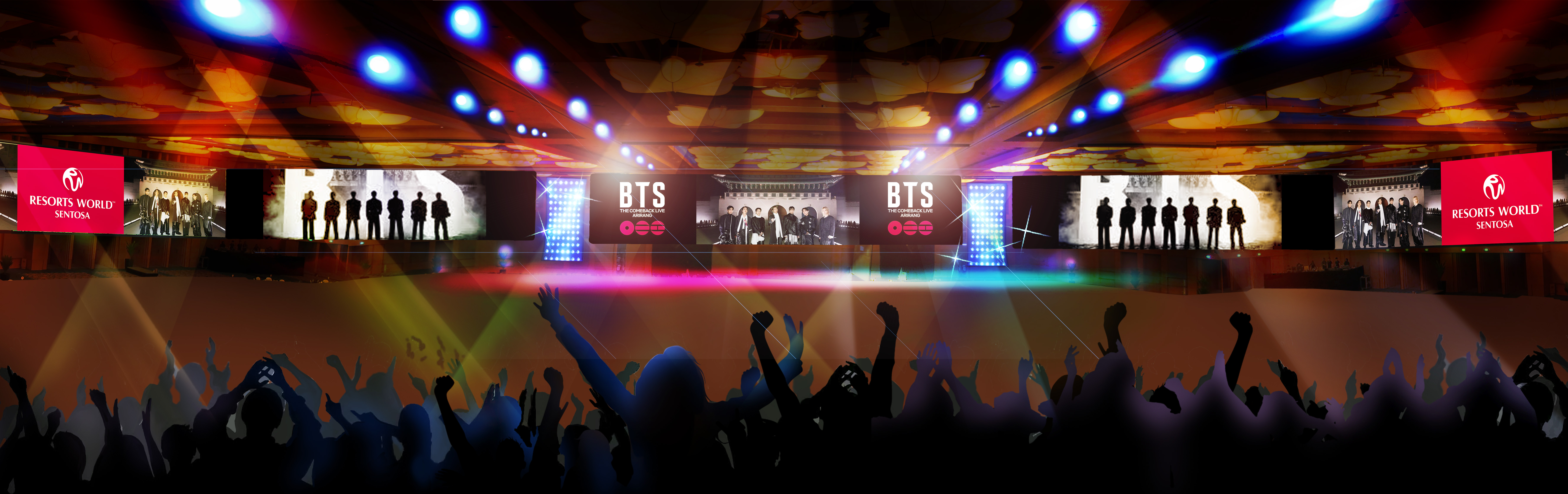 add exciting concert live screening lighting with red and purple color light beam and lasers fill the floor with excited audience in silhouette