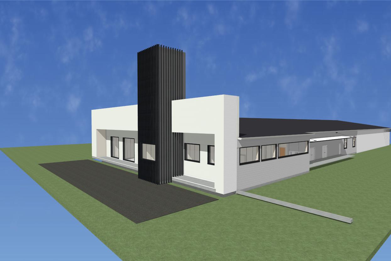 modern architectural building with a minimalist design featuring a white facade with sleek black vertical panels the building has large windows framed in black set against a clear blue sky surrounding the structure is a lush vibrant green lawn and a smooth gray pathway leads to the entrance the atmosphere is serene and contemporary capturing a clear sunny day