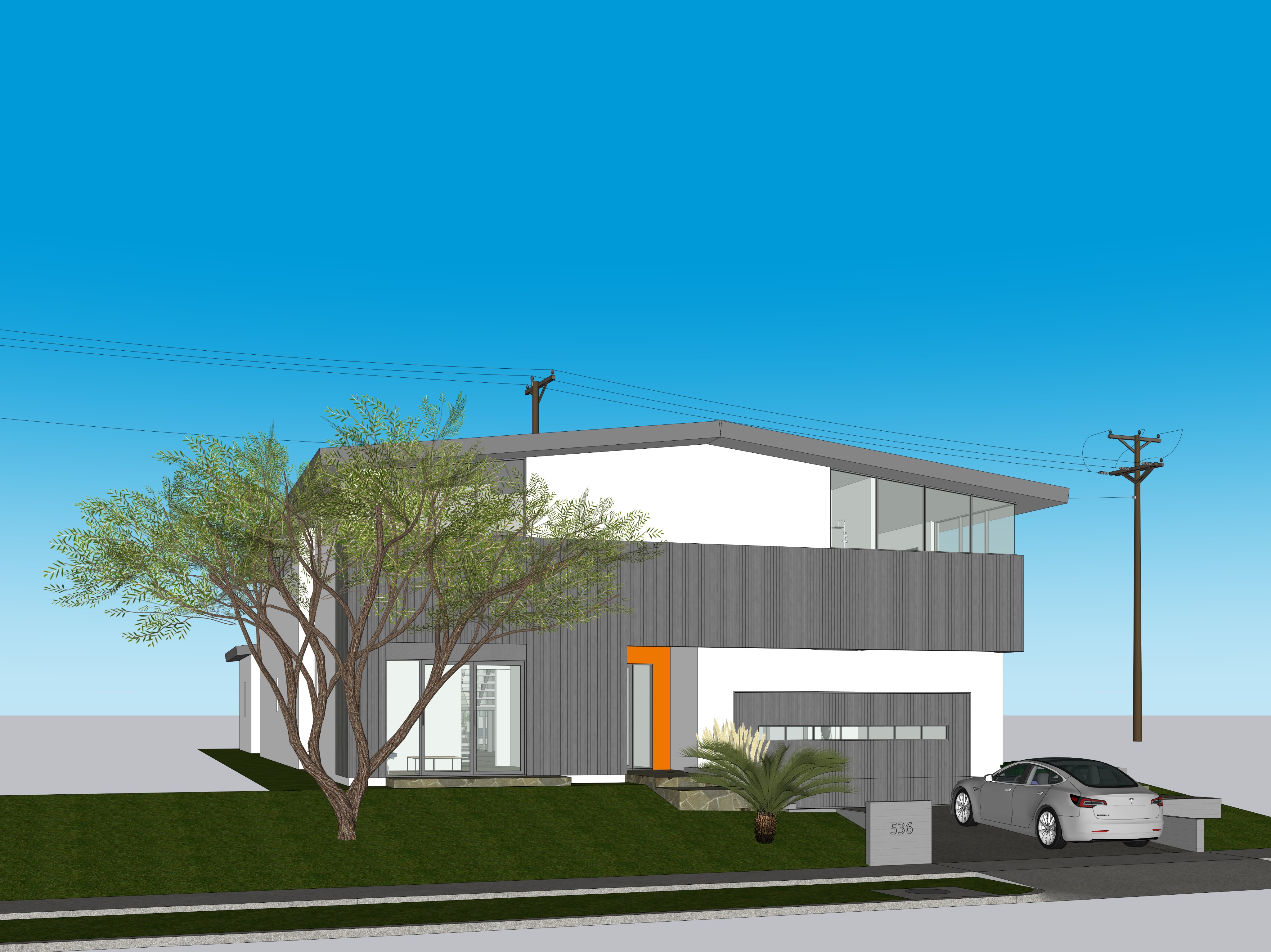 afternoon view add california wild grasses and flowers to the landscape add grass in the the yard space enhance the glazing materials add some palms and trees adjacent to the house on the left and right sides of the view add some lights in the planting areas use the perspective view from the source image add a woman walking a golden doodle on the sidewalk add a man and girl waling towards the front entry door add a desert willow tree in the front yard on the left side of the view make the siding a tongue and groove vertical wood in a medium gray tone the wood siding is vertical tongue and groove material add a few seagulls flying above in the sky in the distance the low walls around the driveway and yard board formed concrete