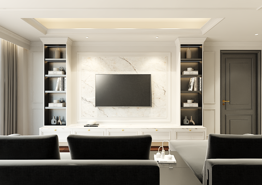 use warm ambiance light enhance the modern classic living room design background of the panel is glossy marble panel with white and black doff color paint darken the dark color make it as realistic as possible and gold handles