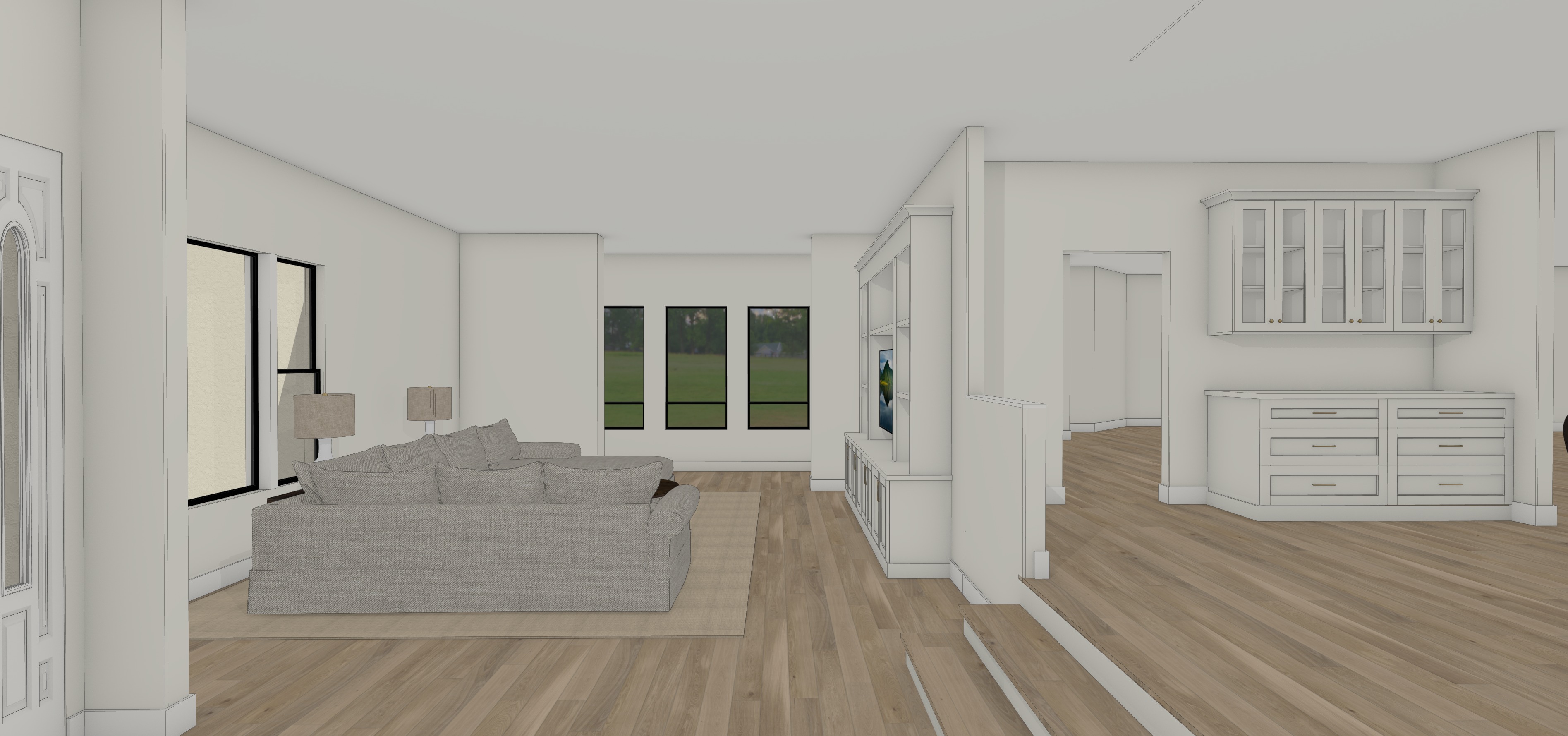 create a beautifully rendered interior of a modern home the room features white walls and cabinetry with a subtle cream undertone the floor is a warm light oak wood adding a natural element there is a creamy upholstered sofa on the left a staircase ascends to the right drawing the eye upward large windows set in the back fill the room with natural light their lush green view enhancing a calm and inviting atmosphere soft natural light floods the scene creating gentle shadows and a cozy ambiance