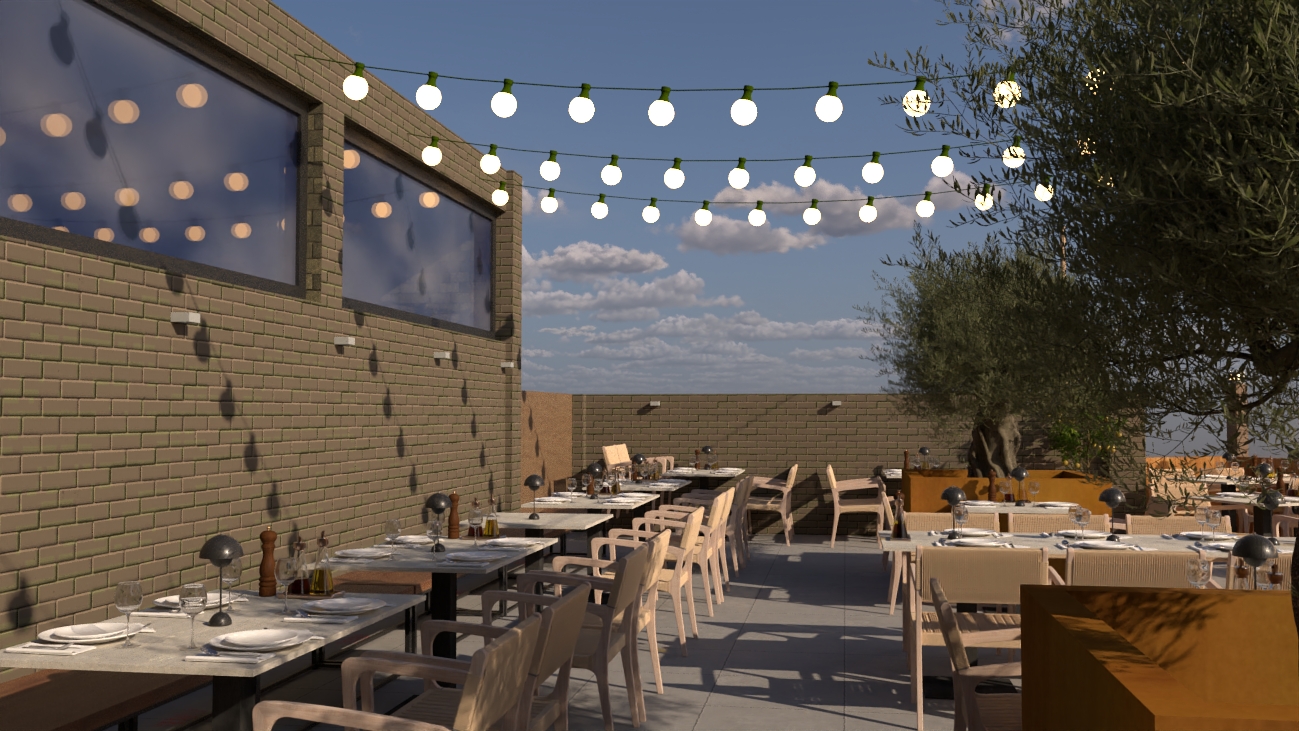 a tranquil outdoor restaurant setting under a clear blue sky with fluffy white clouds the walls are textured with light gray brick string lights hang above casting a warm inviting glow tables are elegantly set with white tablecloths and polished cutlery chairs have a light wooden finish large potted olive trees add a touch of greenery creating a cozy and serene atmosphere the overall ambiance is warm and inviting perfect for a relaxed dining experience