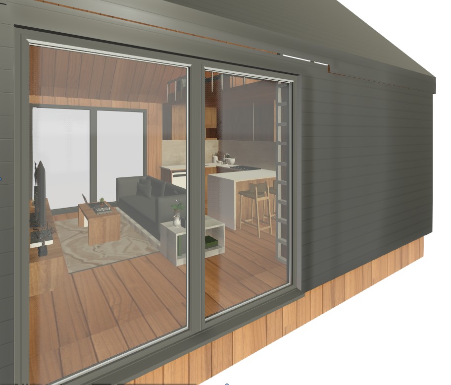 make it look like in real life render it add mountains and forest behind windows and around the house make couch white