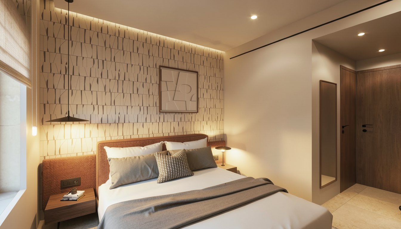 architectural interior photography enhancement only preserve the exact composition geometry object placement proportions scale surface patterns artwork and product details exactly as provided all furniture and objects are real items for sale and must remain visually identical to the input image do not redesign restyle reinterpret replace remove add or modify any objects do not alter wallpaper pattern fabric prints stool pattern alignment perfume bottle labels lamp details mirror detailing hardware or color accuracy maintain exact color integrity and pattern alignment enhance realism only through natural directional window lighting soft physically accurate shadow falloff subtle ambient occlusion where objects meet surfaces realistic fabric gravity without shifting or distorting patterns true to life material rendering linen cotton wood grain marble veining glass brass accurate optical mirror reflection of the adjacent wall based on correct perspective apply a high resolution architectural digest editorial photography finish balanced dynamic range crisp edge clarity natural contrast clean highlight control no stylization this is a lighting and material realism enhancement pass only no generative redesign no reinterpretation no object modification