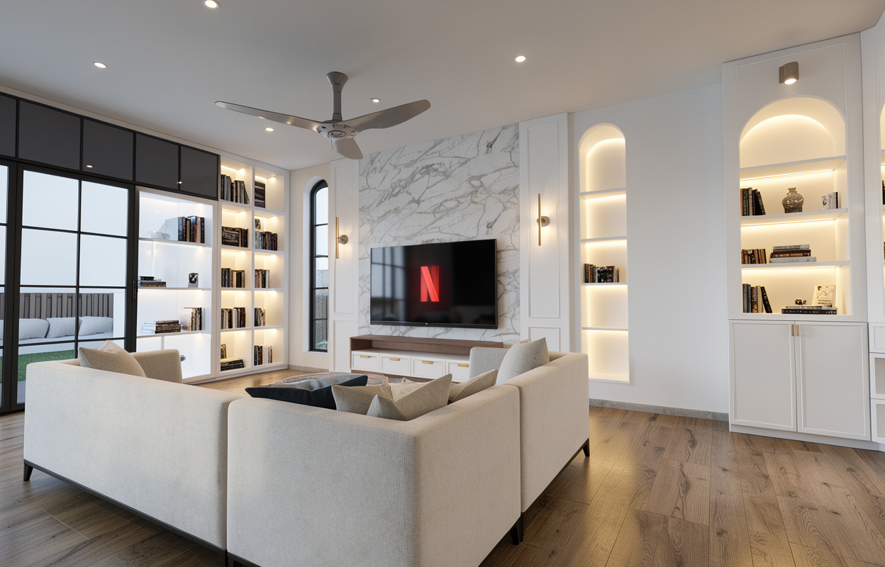 render a photo realistic picture of this 1 200 square foot pavilion located in selma alabama situated near a riverfront setting with a contextual relationship to the historic surroundings the architectural concept should blend vintage historic character with modern industrial design the front fa ade and approximately one third of one side of the building features traditional red or warm toned brick expressing a classic historic southern aesthetic this portion includes the main public facing elements aluminum storefront systems with glass entry doors and a concessions service window integrated into the brick fa ade on the brick portion of the side elevation the one third brick side incorporate large vertically scaled black metal lettering spelling the hub with the word the positioned above hub in a stacked arrangement the signage should be backlite and feel bold industrial and integrated into the architecture the remaining two thirds of the building rear and side elevations should transition into a vintage modern industrial expression these elevations should consist primarily of full height glass storefront systems framed in black metal creating transparency and strong indoor outdoor connectivity toward the river incorporate black metal wrapped structural columns along these glazed fa ades to emphasize rhythm and vertical articulation the roof is a metal butterfly roof with matching black metal soffits reinforcing the modern industrial aesthetic while maintaining durability interior furnished interior with only tables and chairs emphasizing openness and simplicity material palette primary brick glass black metal secondary warm natural wood accents burnished cmu interior design intent the pavilion should feel inviting open and civic oriented with a strong visual connection to the riverfront and surrounding landscape lighting soft natural daylight with warm interior glow in evening renderings approximately one third of one side of the building features traditional red or warm toned brick expressing a classic historic southern aesthetic the remaining two thirds of the building rear and side elevations should transition into a vintage modern industrial expression these elevations should consist primarily of full height glass storefront systems framed in black metal creating transparency and strong indoor outdoor connectivity toward the river incorporate black metal wrapped structural columns along these glazed fa ades to emphasize rhythm and vertical articulation the roof is a metal butterfly roof with matching black metal soffits reinforcing the modern industrial aesthetic while maintaining durability lighting soft natural daylight with warm interior glow in evening renderings