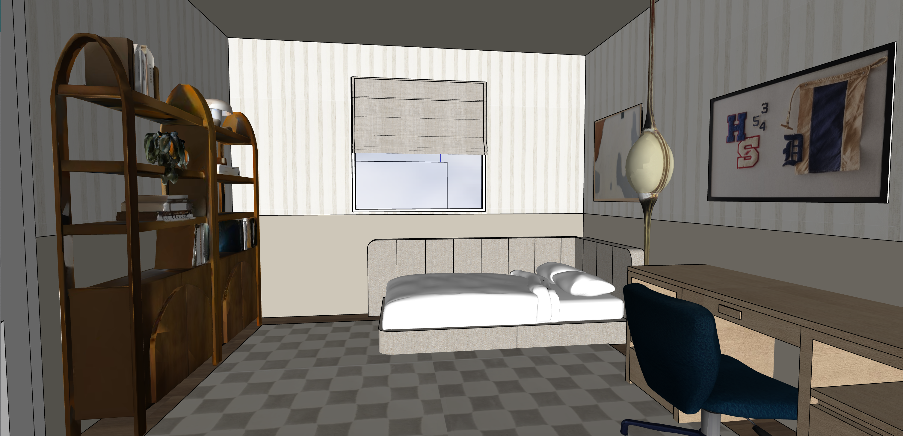 extra large checkered rug in ivory and grey with a unique modern floor to ceiling lamp next to the bed