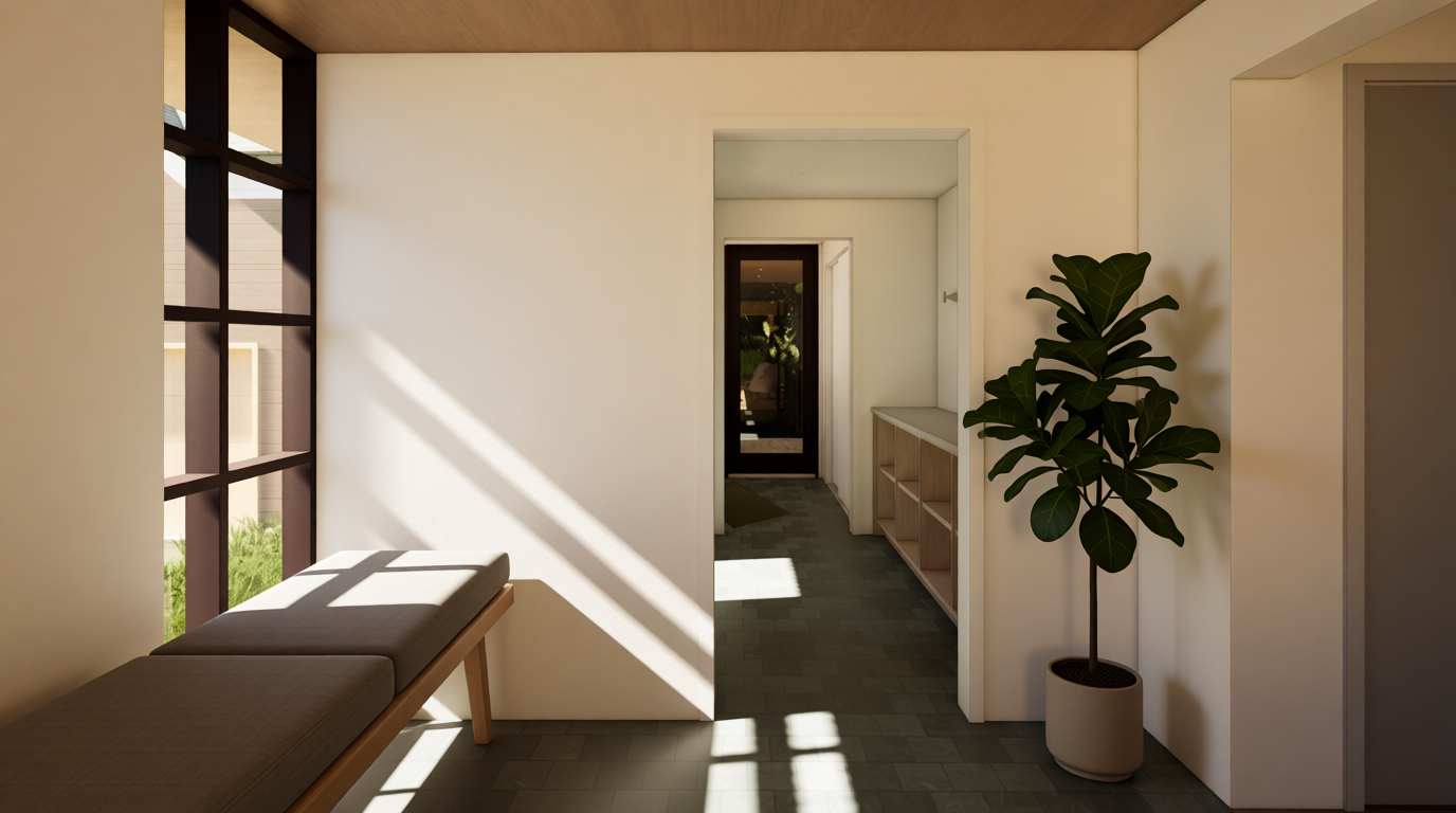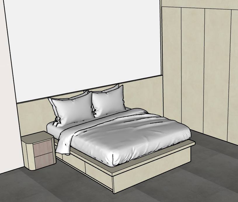 photo realistic interior render based on uploaded sketchup snapshot keep all dimensions camera angle and proportions exactly as modeled design a minimalist bedroom with clean lines neutral tones and uncluttered layout add led lighting below the bed to create the illusion of a floating bed and integrate led lighting into the headboard to bring atmosphere and warmth to the space ensure the render conveys a calm modern and inviting environment convincingly showing the client how the final product of the house will look while capturing their attention with the elegance of minimalist design