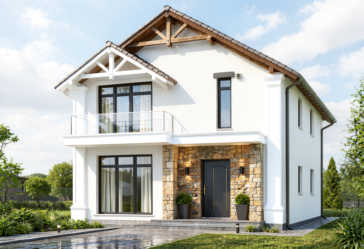 task modify wood part of the roof to white like the left part same material just recolor to white keep shadows reflections and realism maintain thickness and geometry exactly important constraints keep the main house 100 unchanged do not redesign or reinterpret anything do not modify roof windows balcony columns or facade preserve photorealism style highly realistic architectural render clean seamless editing invisible retouching