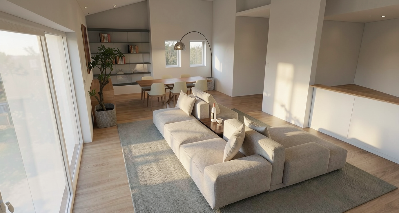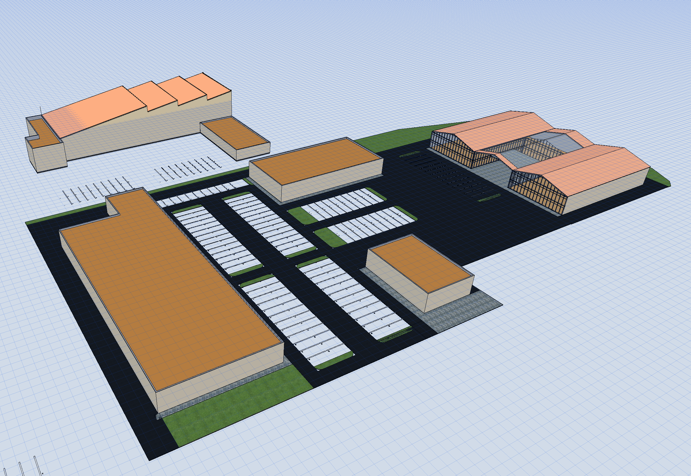 photorealistic architectural render of a commercial masterplan development preserving the exact building geometry and layout from the reference model the scene includes five main volumes a commercial gallery building in on the right with large glass facades and an open central passage a fast food drive thru building on the right a large hypermarket building on the left an industrial buliding in the back the camera is positioned at a slightly elevated perspective showing the parking areas and circulation clearly important constraint maintain the original massing proportions and placement of buildings roads and parking layout enhance the environment with rich realistic landscaping and greenery add rows of medium height trees along parking aisles and roads introduce planted islands with grass shrubs and low bushes between parking spaces soften hard edges with green strips and curbs integrated into the parking layout include decorative planting around building entrances the parking area should be realistic asphalt with markings slightly worn with clear white striping add cars parked in some spaces for realism the commercial gallery should have transparent glass fa ades with visible interior activity and the central passage should feel open and inviting the fast food drive thru should include subtle signage drive lanes and a canopy while the hypermarket remains a large clean commercial volume with minimal branding add pedestrian pathways benches and small urban elements integrated into the landscape lighting natural daylight soft shadows slightly warm tone realistic sky materials glass curtain walls metal panels concrete asphalt greenery with varied tones style contemporary commercial development realistic urban planning visualization rendering quality high end photorealistic architectural visualization global illumination realistic vegetation soft shadows atmospheric depth