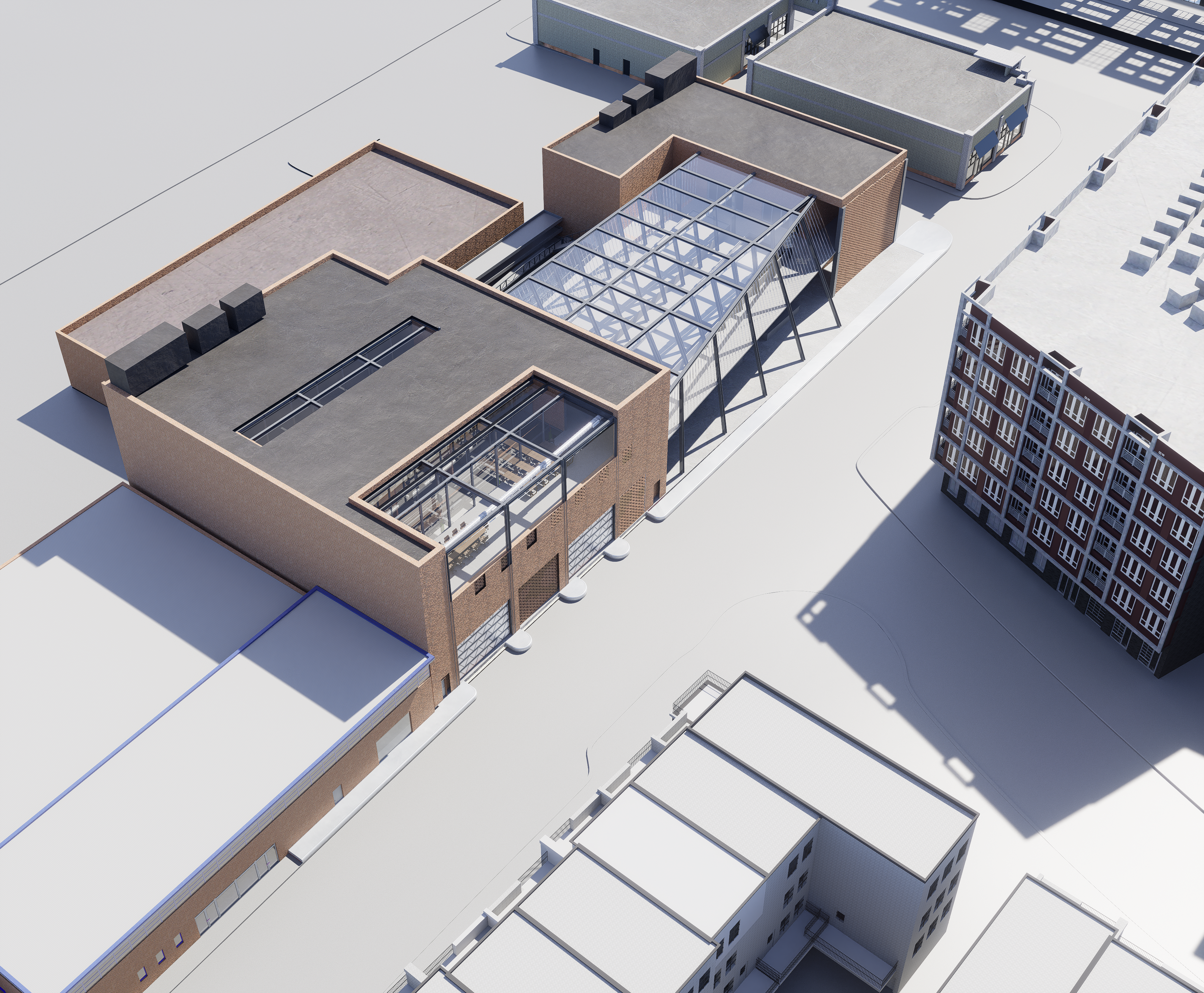 this is a shot of my building located in alexandria virginia the glass bridge connecting the two buildings is supposed to be an urban farm greenhouse with crops only put crops in greenhouse make the environment more realistic with streets and sidewalks and simple acorn lightposts make the surrounding environment look new no trees on sidewalk do not add dirt on roof