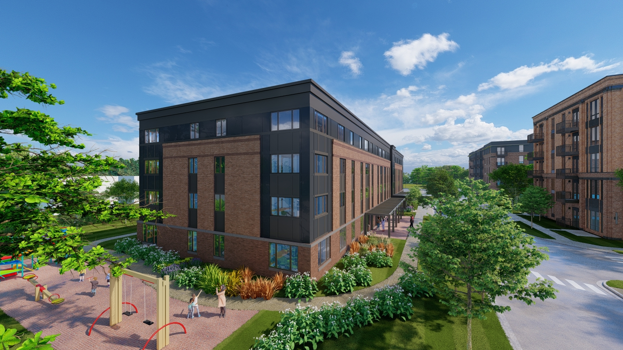 create early sunset rendering with sunlight on both elevations and remove both buildings on right side of image