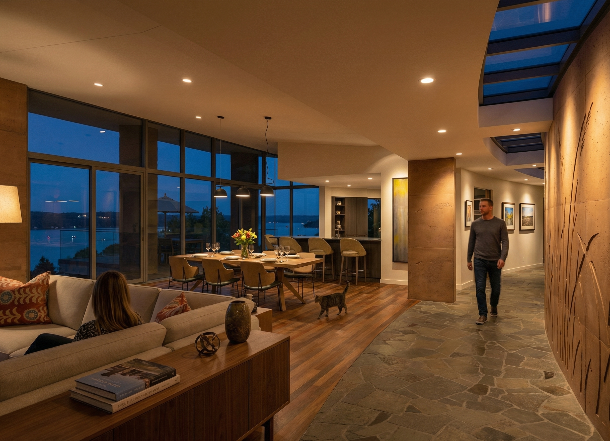 night view with some small lights from boats on the lake add some lights in the far distance coming from houses make the view out of the windows of lake pepin from a high elevation use site cast concrete for the main house material with a natural warm clay color add some abstracted prairie grass patterns in bas relief with a natural warm clay color to the curved site cast concrete wall on the right side of the view cast light on the curved wall at the right side of the view from the recessed lights add table settings and flowers in a vase to the dining room table add a man walking along the curved corridor towards the camera add a man an a woman sitting on the sofa add some accessories on the credenza add light coming from the pendant lights over the dining table add three framed black and white photos on the left wall of the corridor add a cat walking through the dining room use the materials in the original view for reference in this rendering hit the painting on the wall to the right side of the bar stool with light add a woman sanding in the kitchen add some hors d oeuvres and a bottle of wine on the kitchen bar counter add some cook books and small kitchen accessories to the shelves in the kitchen cabinet
