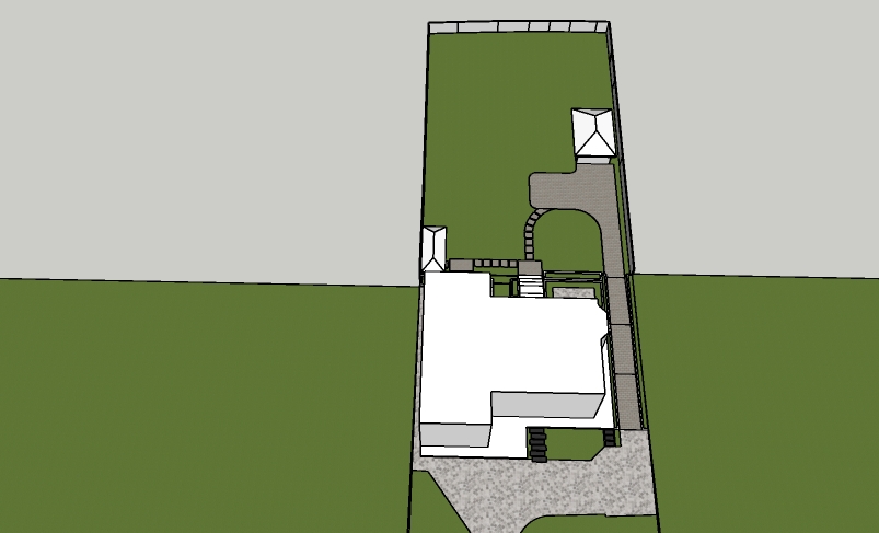 large garden with extensive lawns curved flower beds and seating areas raised terrace shown to the rear of the building with wide steps lots of colourful planting base on the view in supplied picture