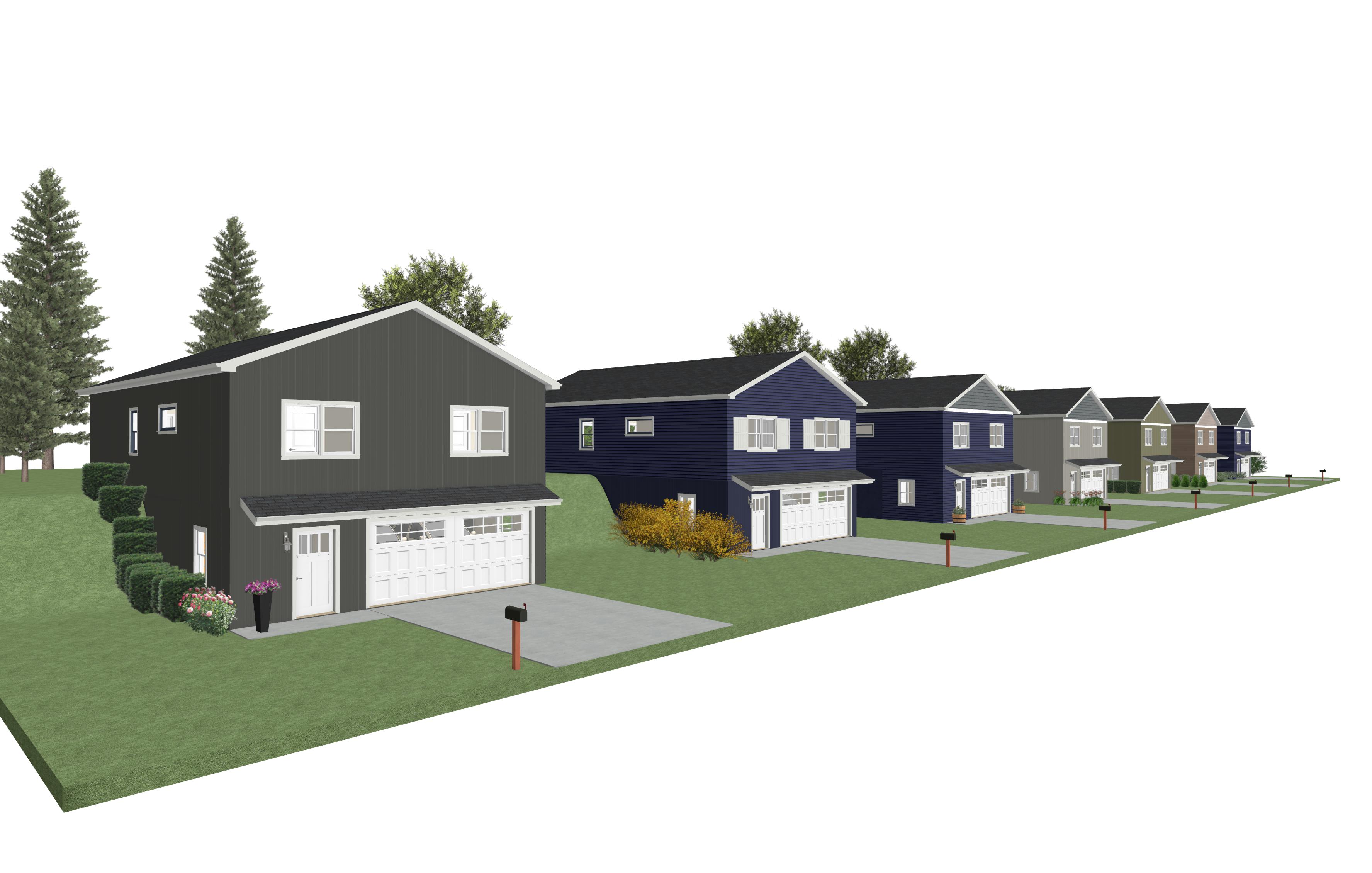 a serene suburban neighborhood with modern two story houses lined up on a slightly sloped street the houses display a dynamic range of colors including slate gray deep navy blue cool taupe and olive green all with white trim the lush green lawns and neatly trimmed hedges add vibrancy while scattered flower pots with blooming plants in shades of pink and yellow enhance the front yards tall green pine trees in the background adding depth and a natural touch to the scenery the atmosphere is calm and inviting with a clear blue sky and soft sunlight casting gentle shadows creating a warm and welcoming environment architecture